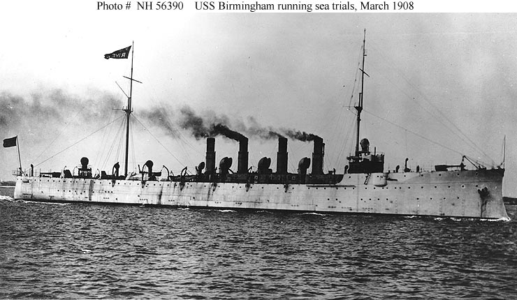 Birmingham (CS-2) Running sea trials in March 1908. She is flying the flag of her builder, the Fore River Shipbuilding Company of Quincy, Massachusetts, from her mainmast. U.S. Naval Historical Center Photograph #NH 56390. |