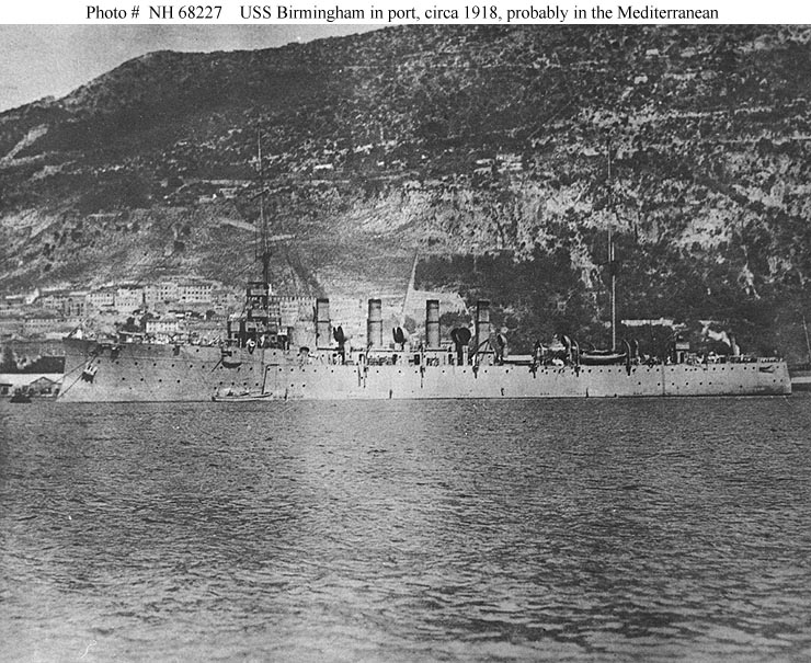 Birmingham (CS-2) Moored in Gibraltar harbor, British Territory of Gibraltar, circa 1918. Courtesy of Donald M. McPherson, 1969. (Caption updated by Andrew Schembri) U.S. Naval Historical Center Photograph #NH 68227. |