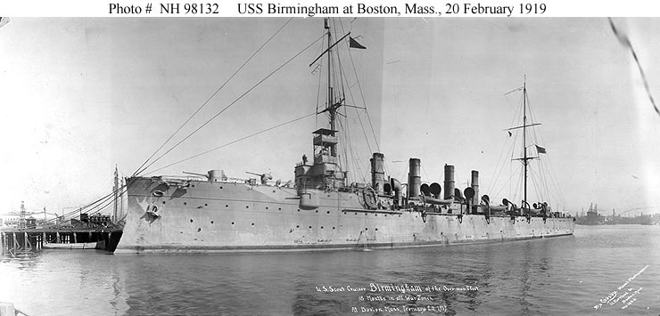 Birmingham (CS-2) At Boston, Massachusetts, 20 February 1919. Photographed by J. Crosby, Naval Photographer, 11 Portland St., Boston, Mass. Courtesy of the Naval Historical Foundation. Crosby Collection. U.S. Naval Historical Center Photograph #NH 98132. |