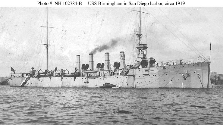Birmingham (CS-2) At anchor in San Diego Harbor, California, circa late 1919 or early 1920, when she was flagship of Destroyer Squadron Four. Note the pair of World War I "Overseas Service" chevrons painted on her forward smokestack. U.S. Naval Historical Center Photograph #NH 102784-B. |