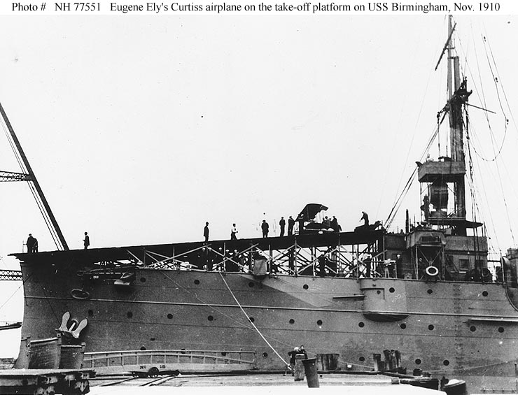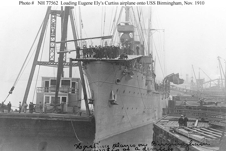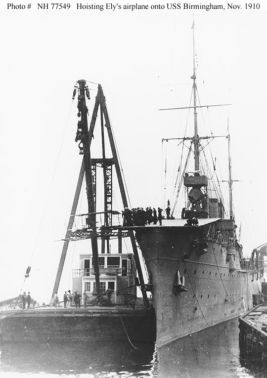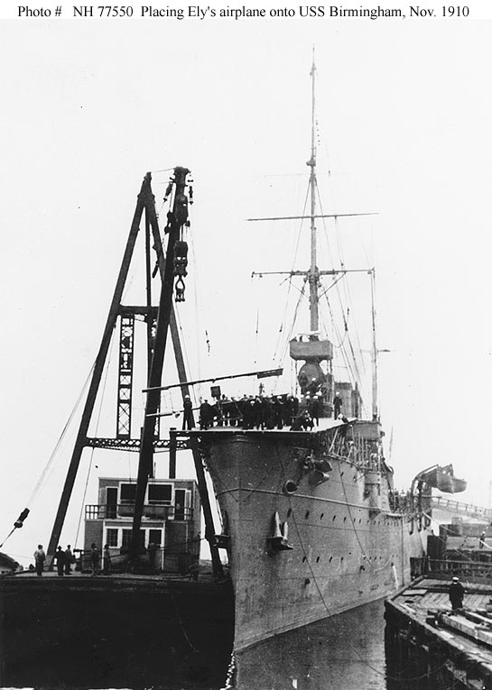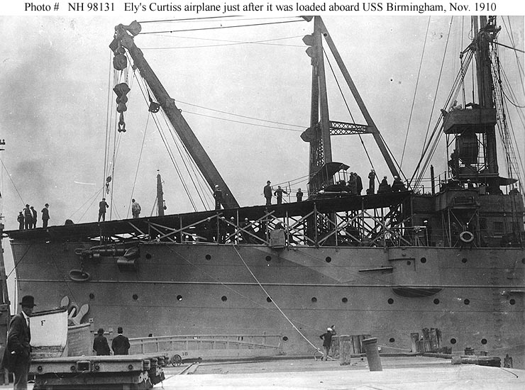 Eugene B. Ely's Curtiss pusher airplane on the takeoff platform of Birmingham (CS-2), just after it was hoisted aboard by a floating crane. Photograph taken at the Norfolk Navy Yard, Virginia, shortly before the flight. Official U.S. Navy Photograph, from the Collections of the Naval Historical Center #NH 98131. |