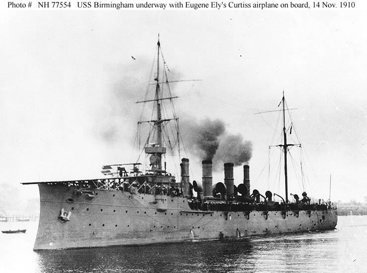 Birmingham (CS-2) steams downriver from the Norfolk Navy Yard, Virginia, with Eugene B. Ely's Curtiss pusher airplane on board, at about midday on 14 November 1910. Ely and his plane made their historic flight later that afternoon. Photograph from the Eugene B. Ely scrapbooks. U.S. Naval Historical Center Photograph #NH 77554. |