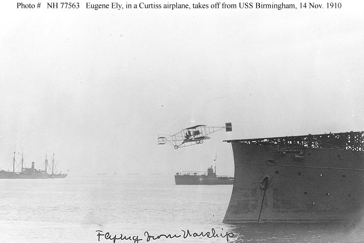 Eugene B. Ely takes his Curtiss pusher airplane off from the deck of Birmingham (CS-2), in Hampton Roads, Virginia, during the afternoon of 14 November 1910. USS Roe (DD 24), serving as plane guard, is visible in the background. Photograph from the Eugene B. Ely scrapbooks. U.S. Naval Historical Center Photograph #NH 76511. |