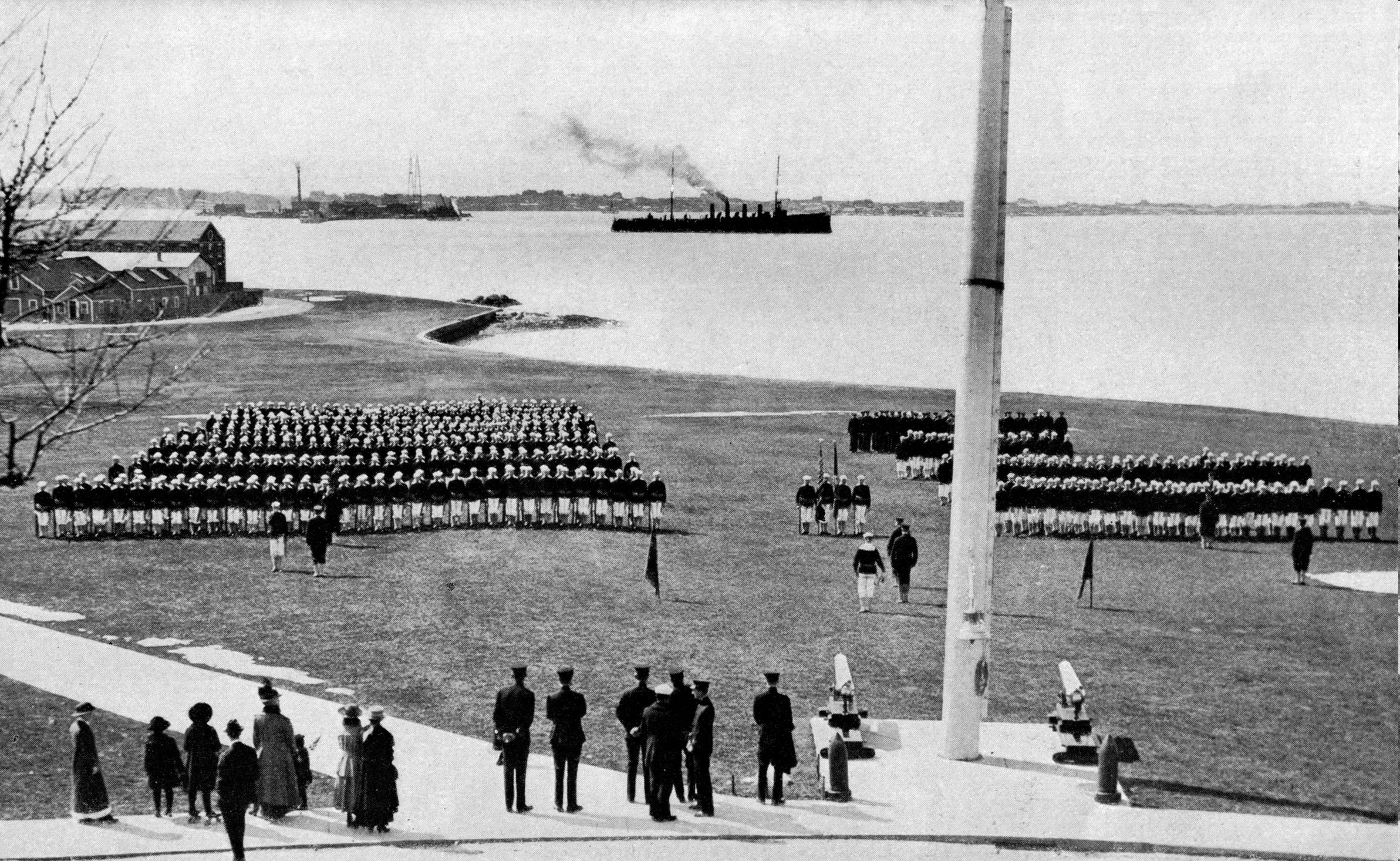 Naval recruits at the Newport Naval Training Station lined up for inspection. The scout cruiser Birmingham (CS-2) can be seen in the background. Photo by Underwood and Underwood. |