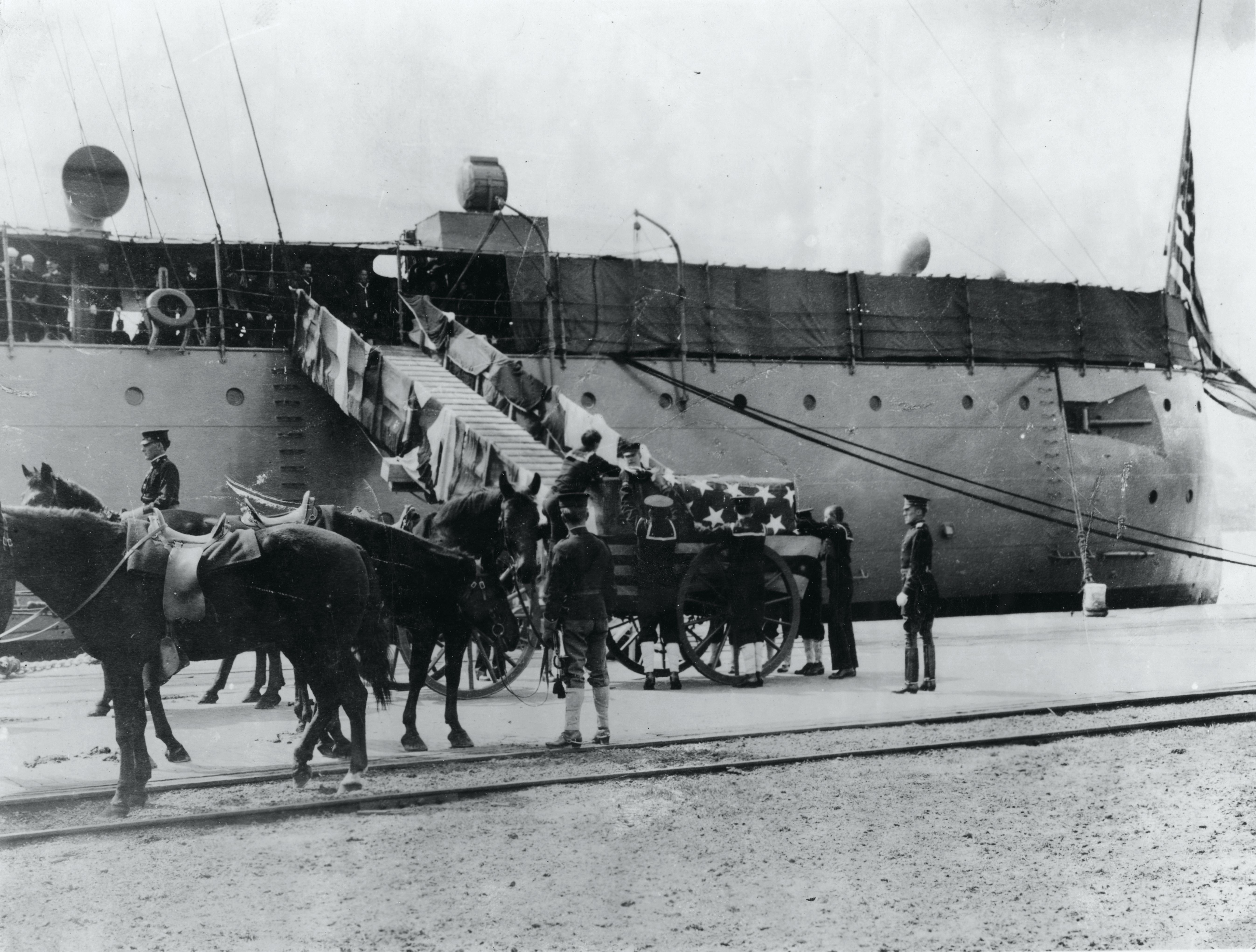 The flag-draped caskets of the victims of the USS Maine explosion are brought ashore at the Washington Navy Yard, District of Columbia, from Birmingham (CS-2), 23 March 1912. U.S. Naval Historical Center Photograph #NH 1690. |
