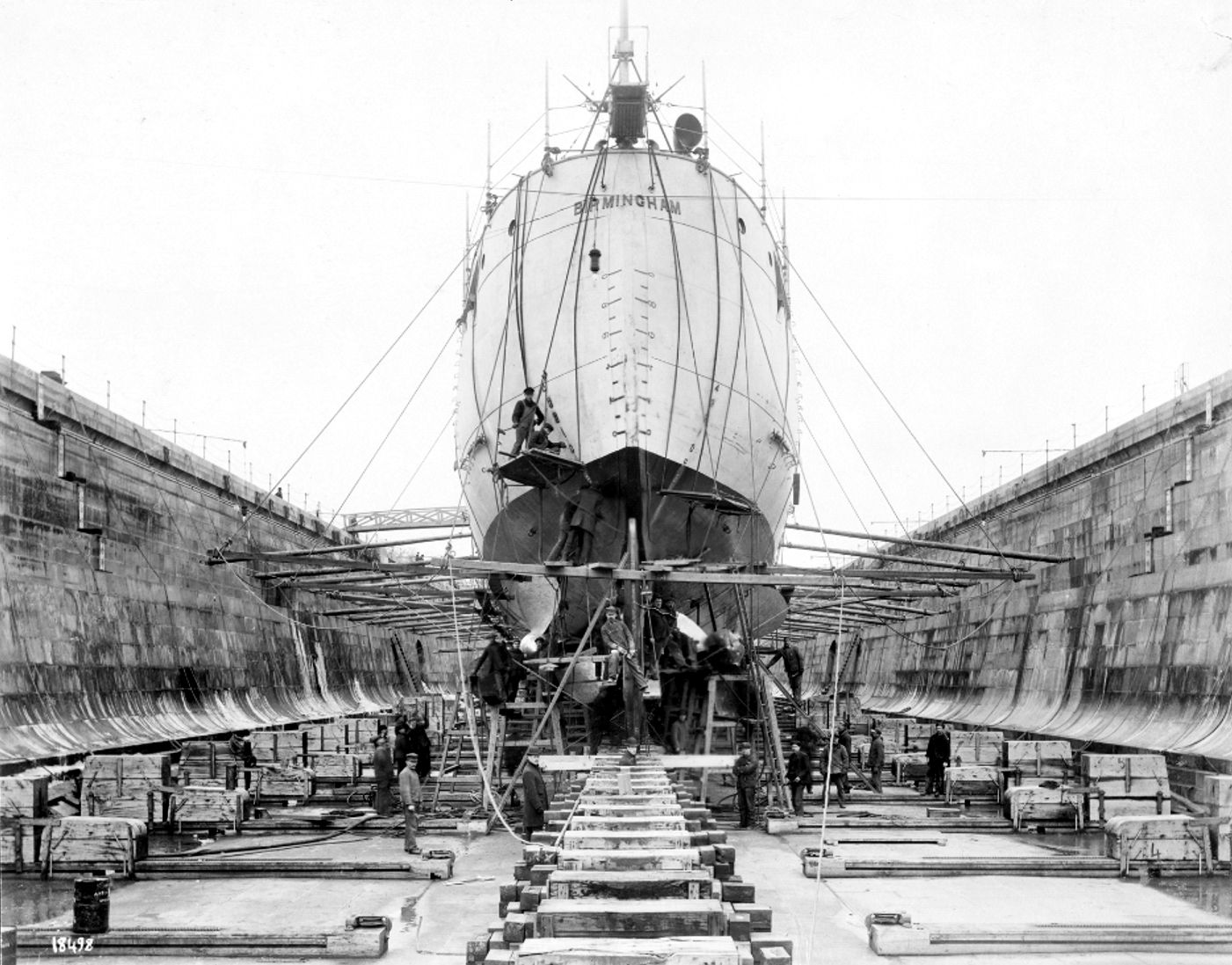 139k | Birmingham (CL 2) in dry dock at the Boston Navy Yard sometime between 17 January?€“18 February 1919 Boston Public Library, Leslie Jones Collections |