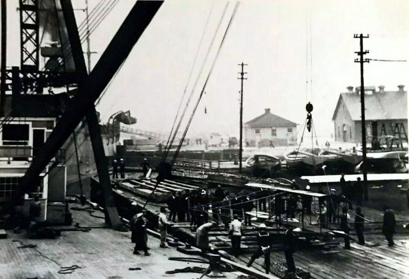 Eugene B. Ely setting his Curtiss Pusher Plane on skids in preparation for hoisting it aboard Birmingham (CS-2) at Hampton Roads VA Navy Yard. November 1910 Photograph. This was not a Navy plane and Eli never was in the Navy, but his importance to Naval aviation is recognized by the USN in many ways, including awarding him the Distinguished Flying Cross many years after his premature death in 1911. Photo from the Eugene B. Ely scrapbooks, Vol. II. Page 80. U.S. Naval Historical Center Photograph |