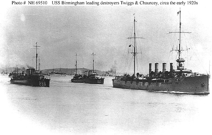 Birmingham (CL 2) Leading destroyers out of a West Coast harbor (probably San Diego), circa 1919-1922. The ships directly behind her are USS Twiggs (DD 127) and USS Chauncey (DD 296). Courtesy of ESKC Joseph L. Aguillard, USNR, 1979. U.S. Naval Historical Center Photograph #NH 69510. |