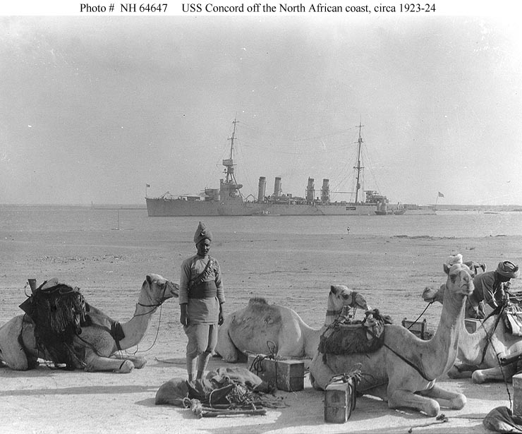 Concord (CL 10) at the edge of the desert off the North African coast, with local camel troops in the foreground, circa late 1923 or early 1924. During her maiden cruise at that time Concord steamed through the Mediterranean Sea and returned to the United States by way of the Suez Canal and the Cape of Good Hope. Donation of Franklin Moran, 1967. U.S. Naval Historical Center Photograph #NH 64647. |