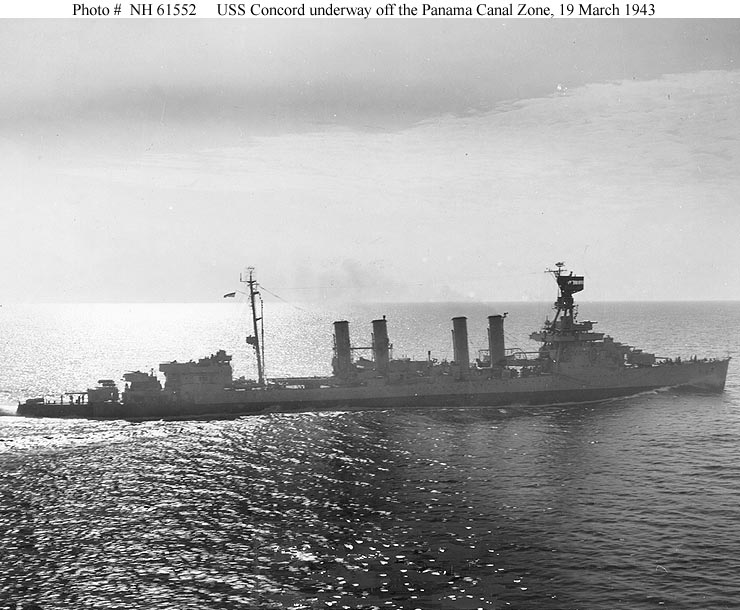 Concord (CL 10) Underway off the Panama Canal Zone, 19 March 1943. Official U.S. Navy Photograph, from the collections of the Naval Historical Center #NH 61552. |