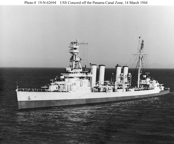 Concord (CL 10) Off the Panama Canal Zone, 14 March 1944. Photograph from the Bureau of Ships Collection in the U.S. National Archives #19-N-62694. |
