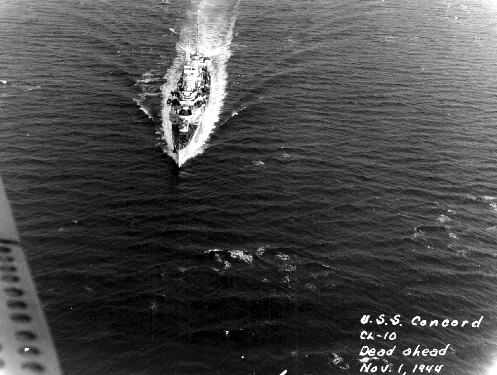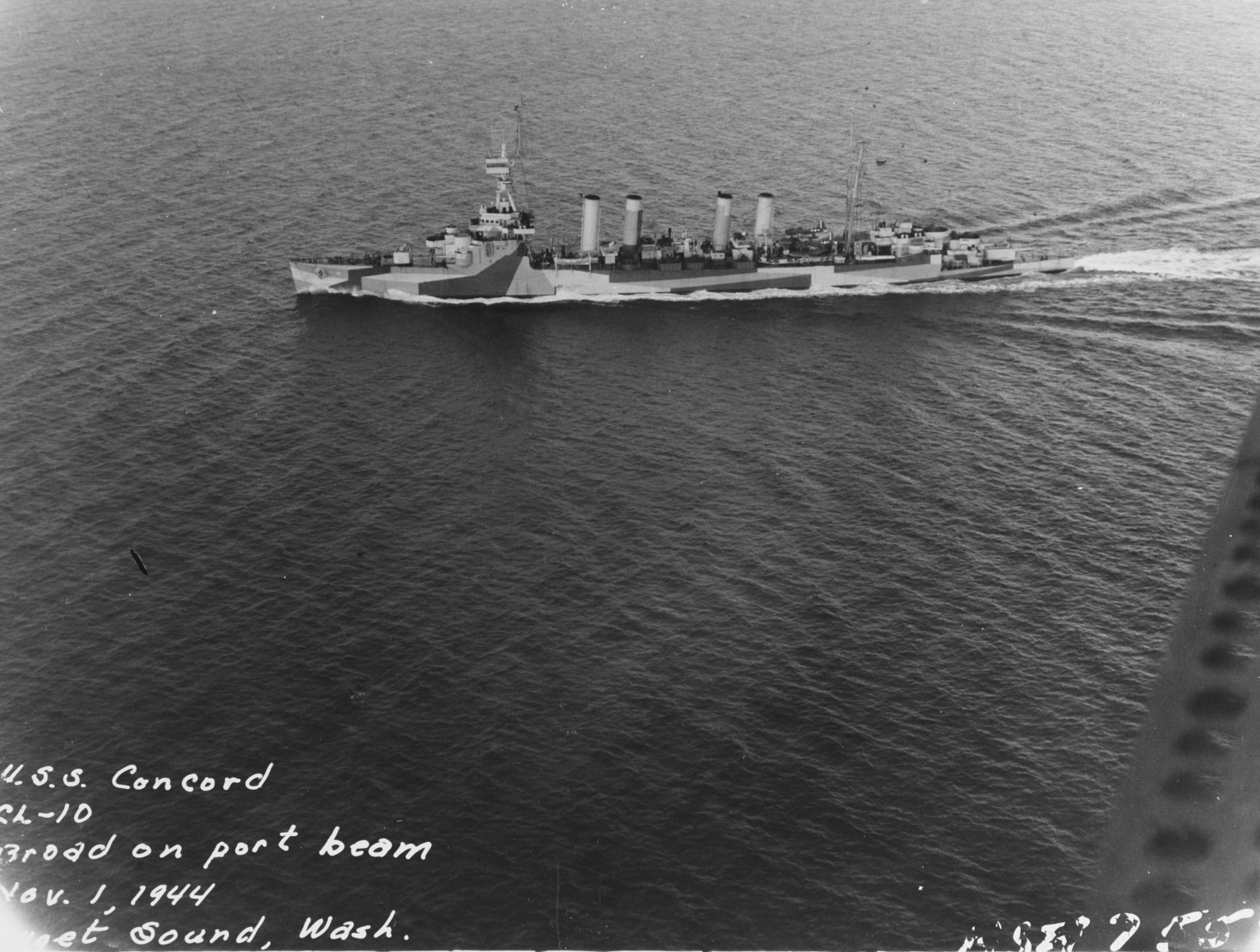 Bows on aerial view of Concord (CL 10) underway in Puget Sound, Washington, 1 November 1944. United States National Archives, Photo #19-N-75594 |