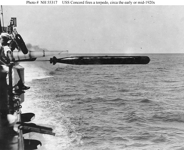 Concord (CL 10) firing a torpedo from her port side upper torpedo tubes, circa the early or middle 1920s. U.S. Naval Historical Center Photograph #NH 55317. |