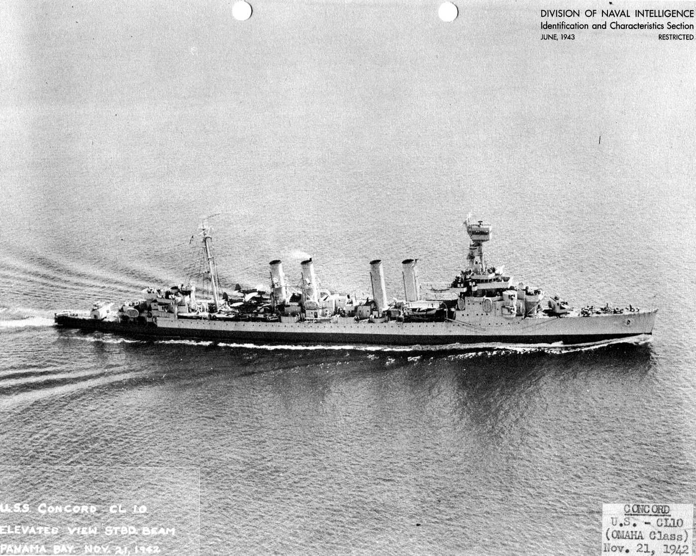 Concord (CL 10) Off Balboa, Panama Canal Zone, 6 January 1943. Photograph from the Army Signal Corps Collection in the U.S. National Archives #USA C-627. |