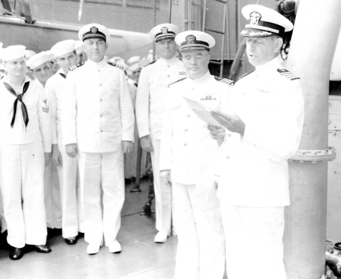 NR | Commodore M. E. Trench, turning over Uncle Sam's newest cruiser, the Concord (CL 10), to Capt. O.G. Murfin. The ceremonies took place at the Philadelphia Navy Yard. | Image and text provided by Library of Congress, Washington, DC. Photo from Evening Star. [volume] (Washington, D.C.) 1854-1972, 18 November 1923, Image 94, via chroniclingamerica.loc.gov. |