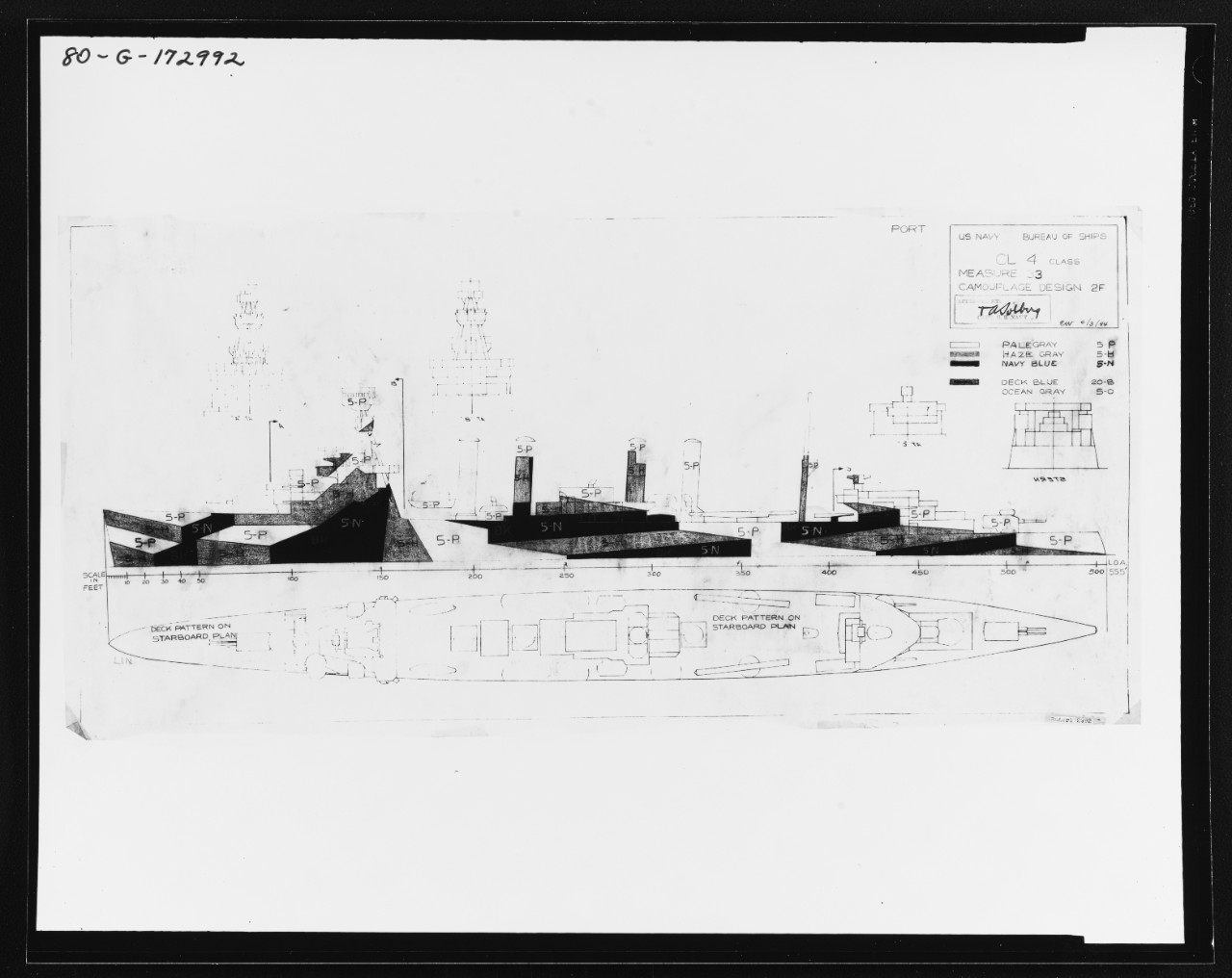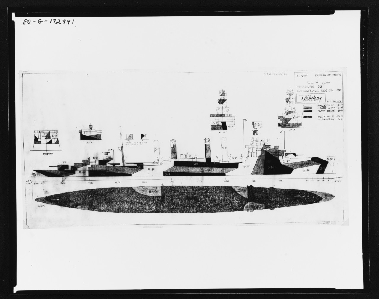 Camouflage Measure 33, Design 2F (Starboard) Drawing prepared by the Bureau of Ships for a camouflage scheme intended for light cruisers of the CL-4 (Omaha) class. This plan, approved by Captain Torvald A. Solberg, USN, is dated 3 June 1944. It shows the ship's port side. Concord (CL 10) and USS Trenton (CL 11) were painted in this scheme, though the colors used for the latter appear to have been the darker tones of Measure 32. Official U.S. Navy Photograph #80-G-172992, now in the collections of the National Archives. |