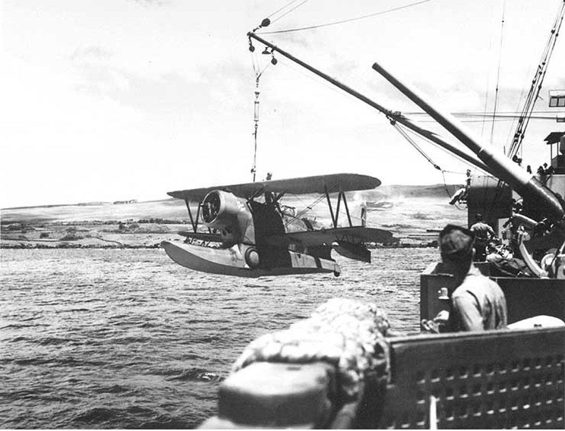 415k | Concord (CL 10) hoists a Grumman J2F (wearing the nickname: "The Galloping Ghost") during flight operations at Hanga Roa, Easter Islands, in support of Rear Admiral Richard E. Byrd's South Pacific Base Examination Cruise, 10 November 1943. Color has been completely lost in this item. Original transparency has turned entirely monochromactic red. | USN photo 80-G-K-2343 via history.navy.mil | |