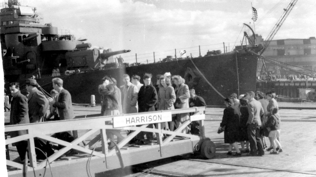 Concord across Pier 1, South Boston Naval Annex, and is open for public visiting on 27 October 1945. She frames a scene of the public welcoming the crews of Concord, USS Harrison (DD 573), and Rogers (DD 876) from the other side of the world. Photo by Tom McCann. |