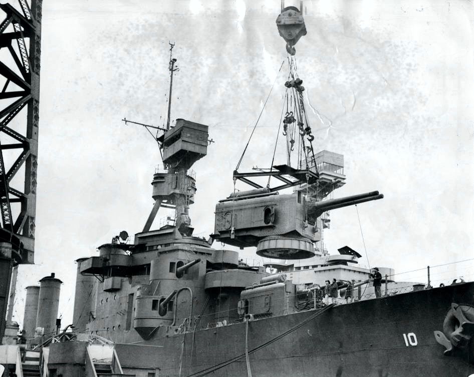 The original caption for this photo was "A crane is removing a twin 6-inch gun turret of the ex-Concord (CL 10) on 11 January 1946. This gun mount is credited with the firing of the last salvo in WW2 against the Japanese. The ship, on 15 August 1945, was part of Task Force 92 and was bombarding shipping and shore targets on the Japanese Kuril Islands. The previous shot had misfired just before the cease fire was announced, but the ship received special permission to fire one more shot, rather than manually unloading the gun." but this appears to be incorrect. It appears that the turret in the air has been lifted from the Omaha Class cruiser outboard of the Concord. Note the person with the tagline attached to the gun barrel. This is being used to control the swing of the turret as it is lifted aross the Concord. The aft turret would not have been lifted the length of the ship to it's current position in the photo. Philadelphia Evening Bulletin, George D. McDowell Collection. |