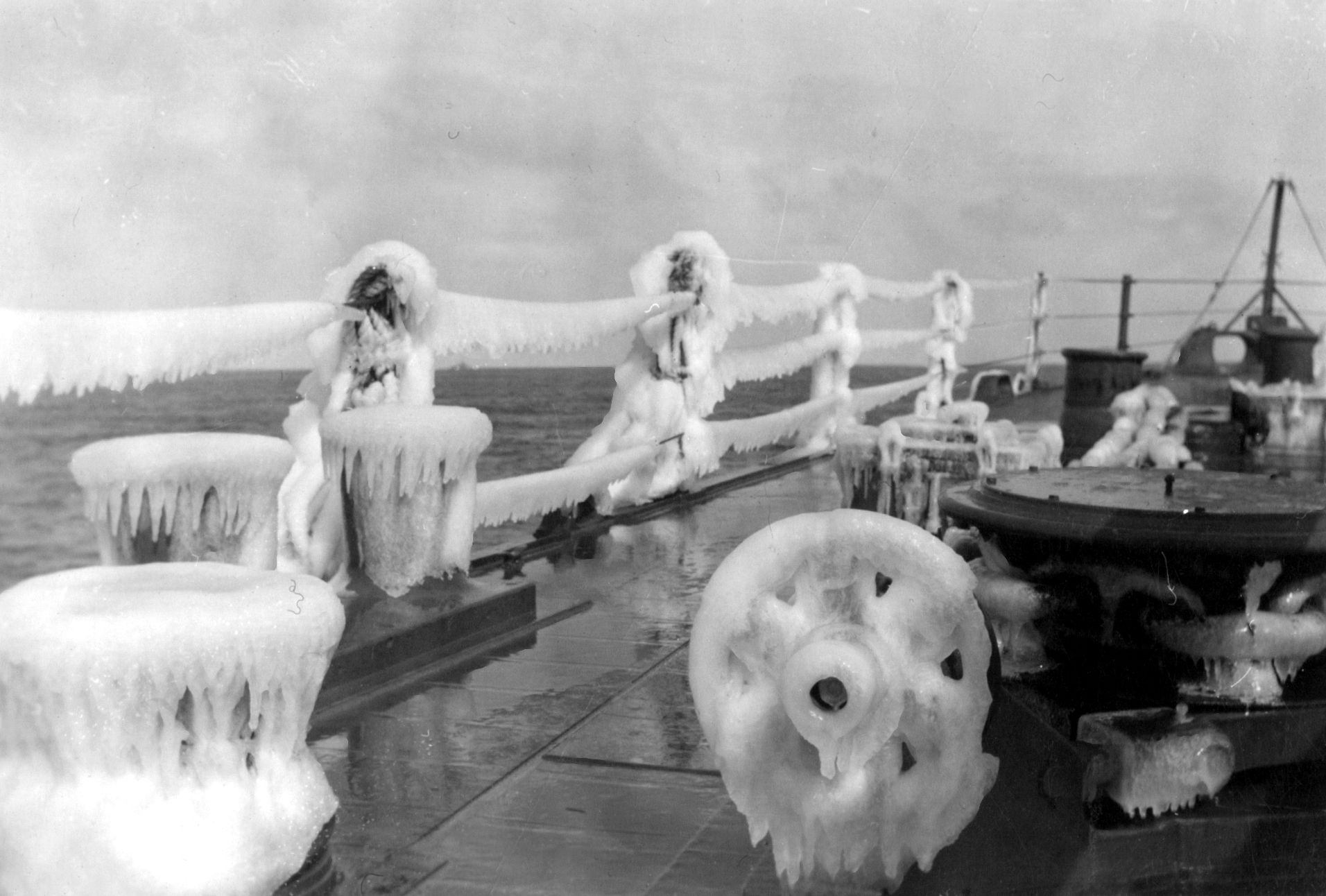 786k | Mines on an Omaha class (CL 4-13) light cruiser taken while the ship was underway at sea, looking aft, showing the very wet conditions that were typical on these cruisers' after decks when they were operating in a seaway. Photographed circa 1923-1925, prior to the addition of a deckhouse just forward of the ships' after twin six-inch gun mount. | Donation of Ronald W. Compton, from the collection of his grandfather, Chief Machinist's Mate William C. Carlson, USN. U.S. Naval History and Heritage Command Photograph. Photo NH-99637 courtesy of history.navy.mil |
