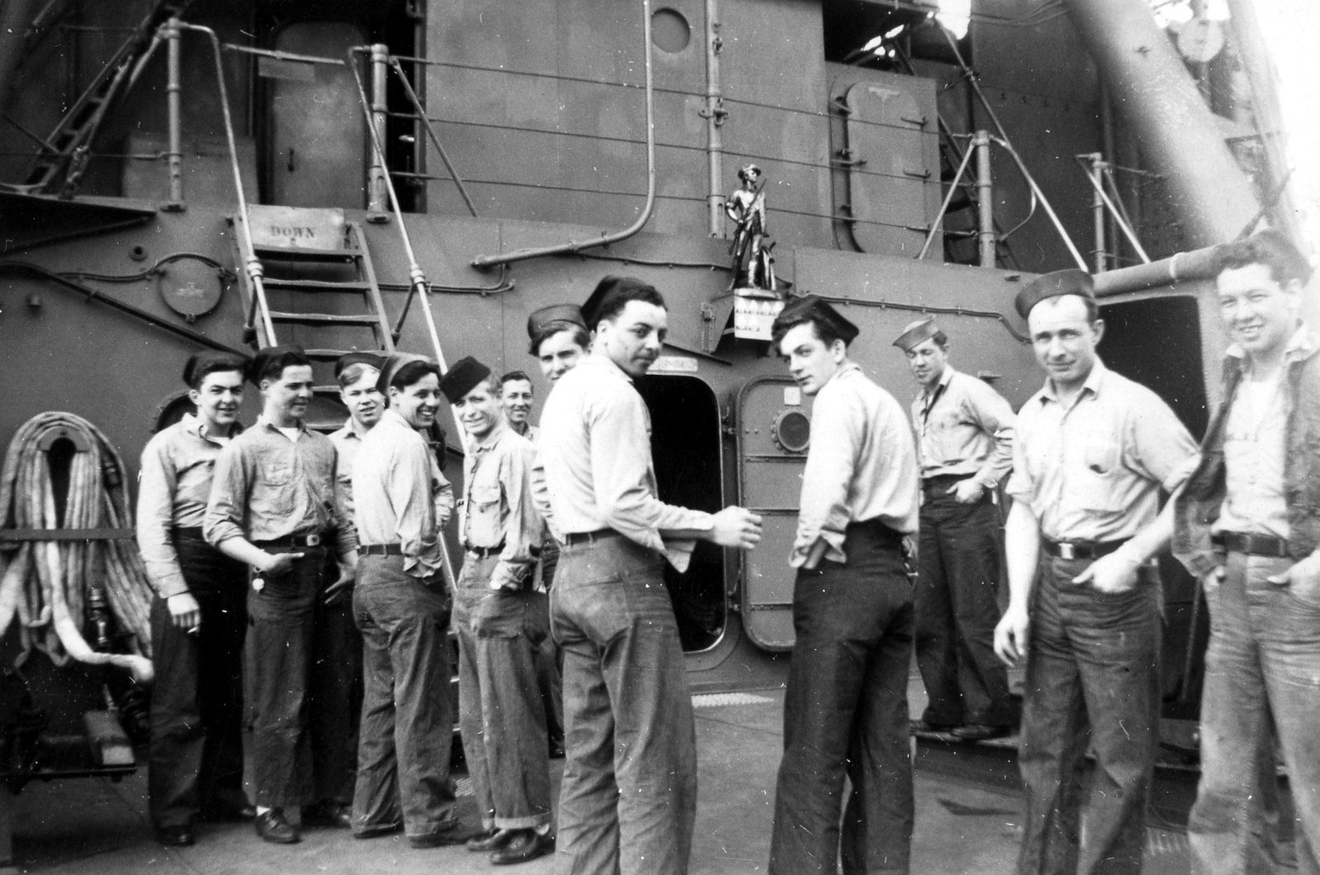 332k | Crewmen of Concord standing on the main deck, aft of the forward superstructure, circa March 1944 - August 1945. Note the statue of the minuteman mounted on the bulkhead with the ship's scoreboard below it. From the collection of BM1 Harry Roy Olson. | Jenni Olson | |