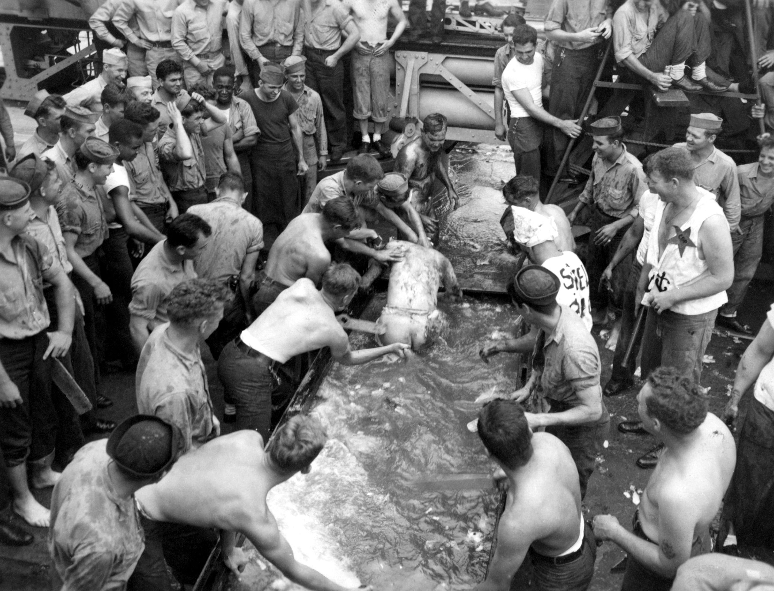 728k | Shellback initiation on the main deck, aft, near the catapults, circa March 1944 - August 1945. From the collection of BM1 Harry Roy Olson. | Jenni Olson | |