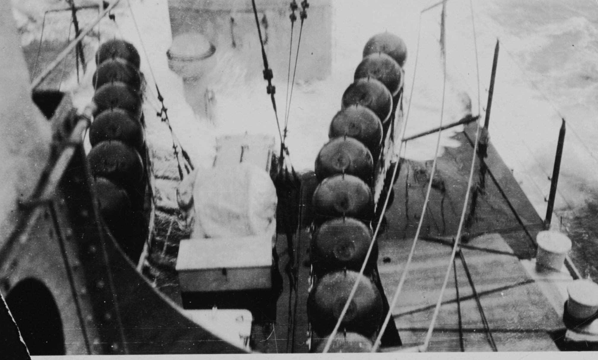 301k | Mines on an Omaha class (CL 4-13) light cruiser seen from off the ship's starboard quarter, showing mines on their tracks fore and aft of the after six-inch gun mount. | Donation of Ronald W. Compton, from the collection of his grandfather, Chief Machinist's Mate William C. Carlson, USN. U.S. Naval History and Heritage Command Photograph. Photo NH-99638 courtesy of history.navy.mil |
