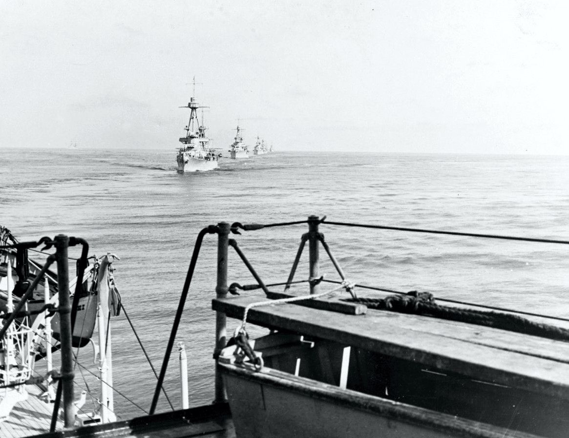 View taken from the deck atop the aircraft hangar of USS Chicago (CA 29, circa 1932, and shows in line astern formation:USS Salt Lake City (CA 25), USS Louisville (CA 28), USS Northampton (CA 26), USS Pensacola (CA 24), USS Chester (CA 27), and USS Augusta (CA 31). Naval History and Heritage Command, Catalog No. NH 51838 |