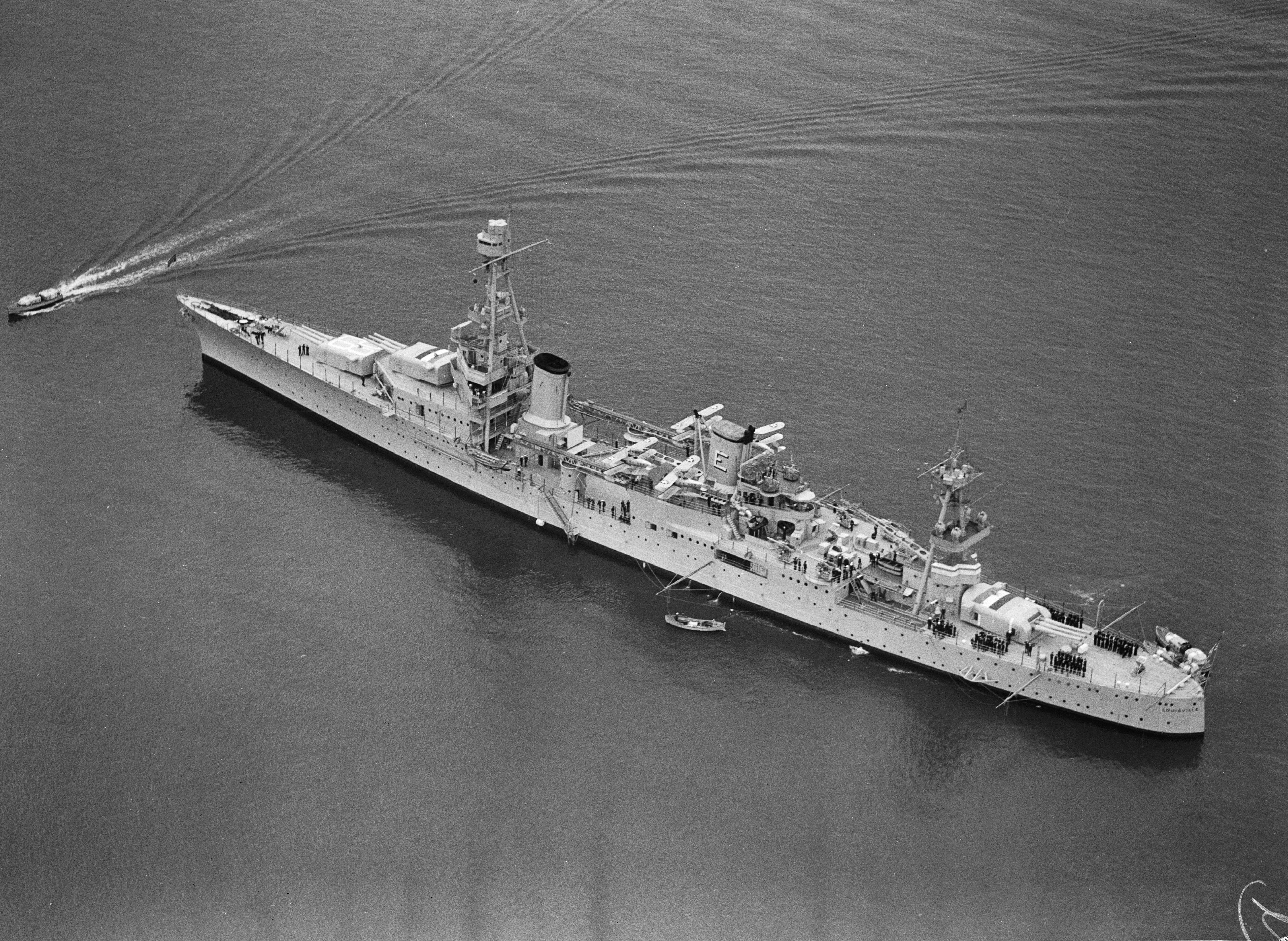 Louisville arrives at Pearl Harbor, Oahu, Territory of Hawaii, 14 March 1937 with passengers rescued from the British M. S. SILVER LARCH, which was afire about 450 miles northeast of Honolulu. Naval History and Heritage Command Photo #NH 96170. |