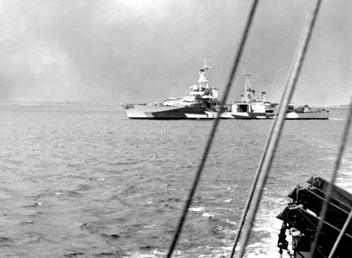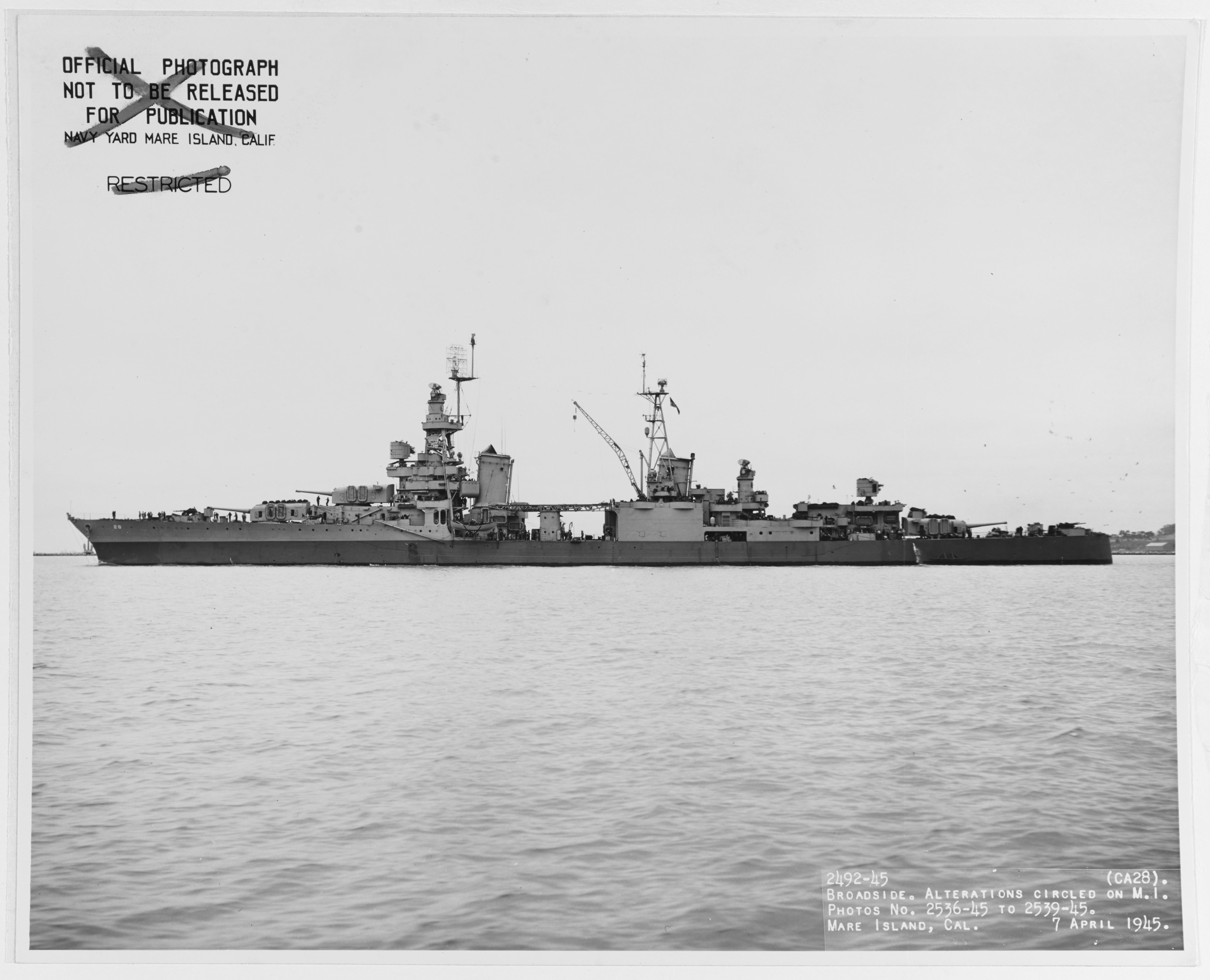 USS Louisville (CA 28) off the Mare Island Navy Yard, California, 7 April 1945. Photograph from the Bureau of Ships Collection in the U.S. National Archives #19-N-83896. |