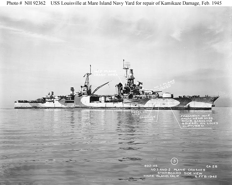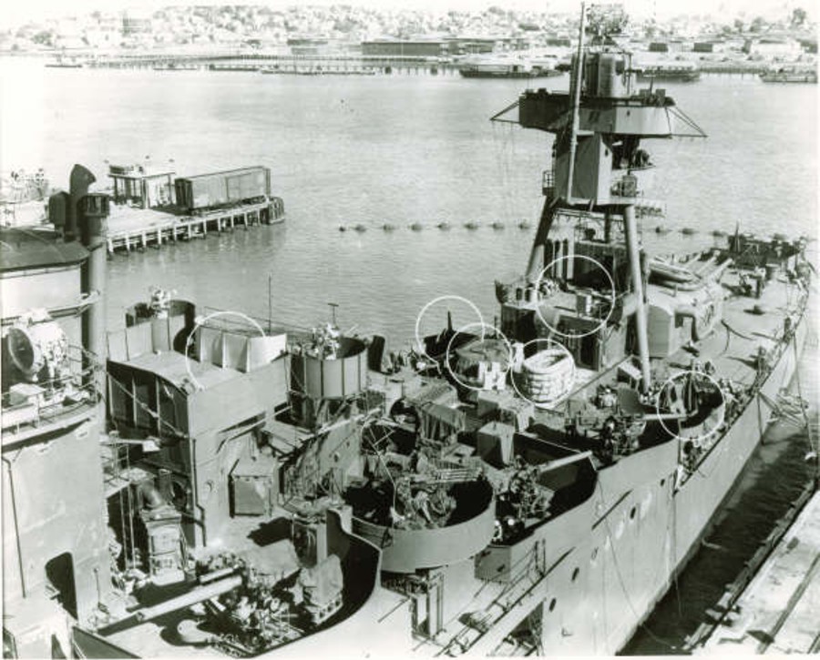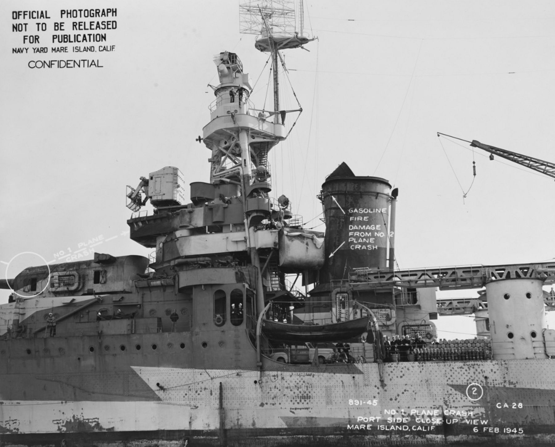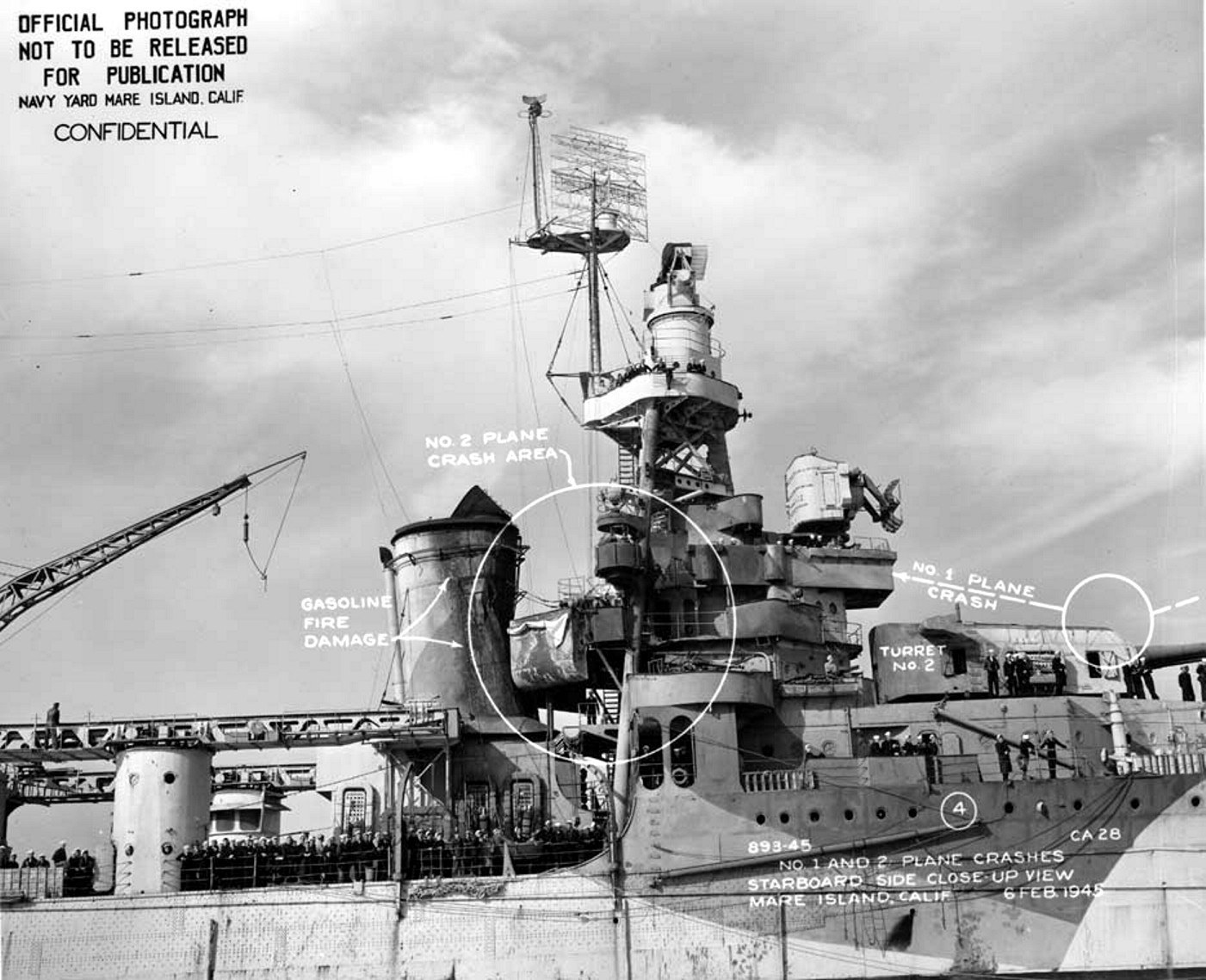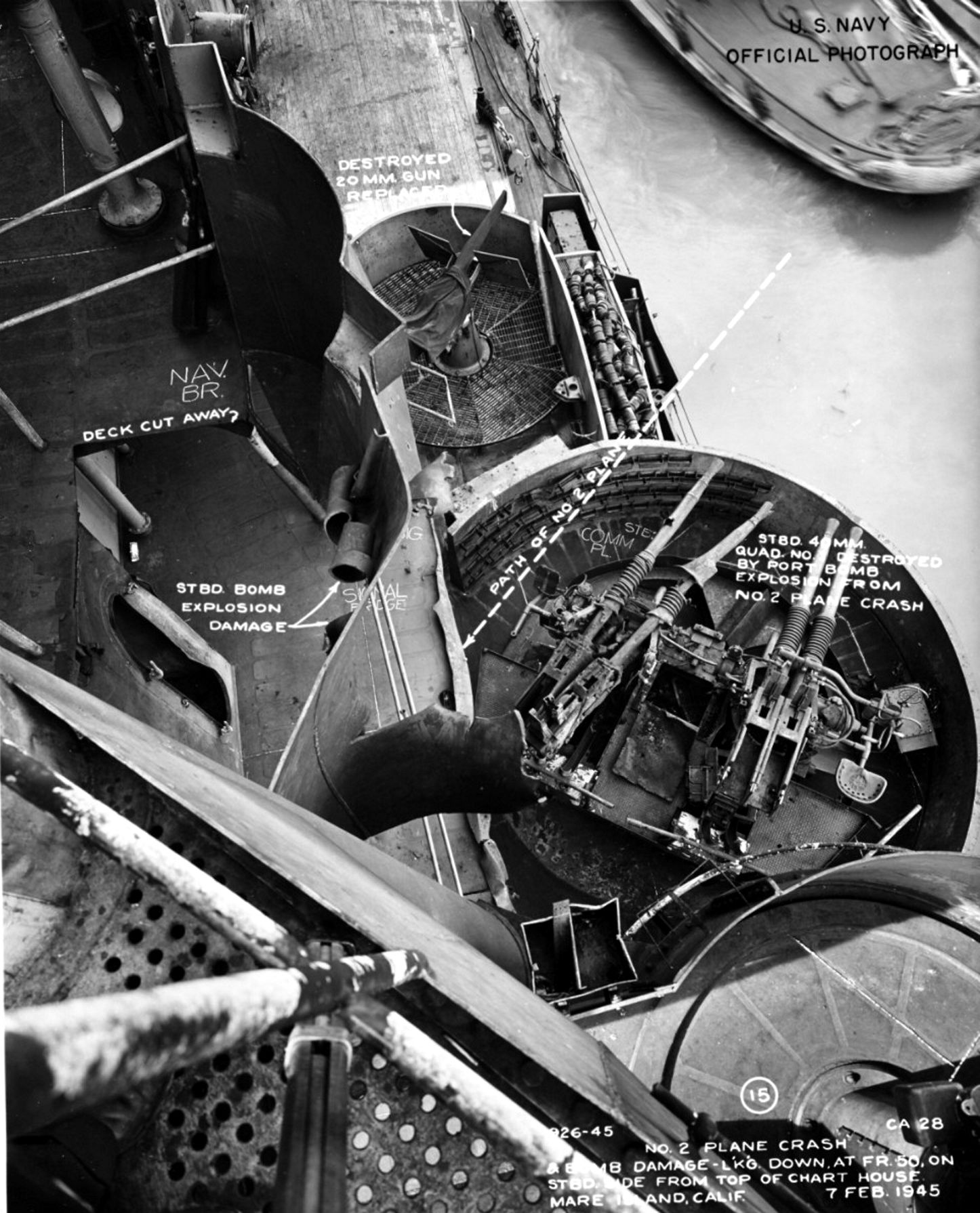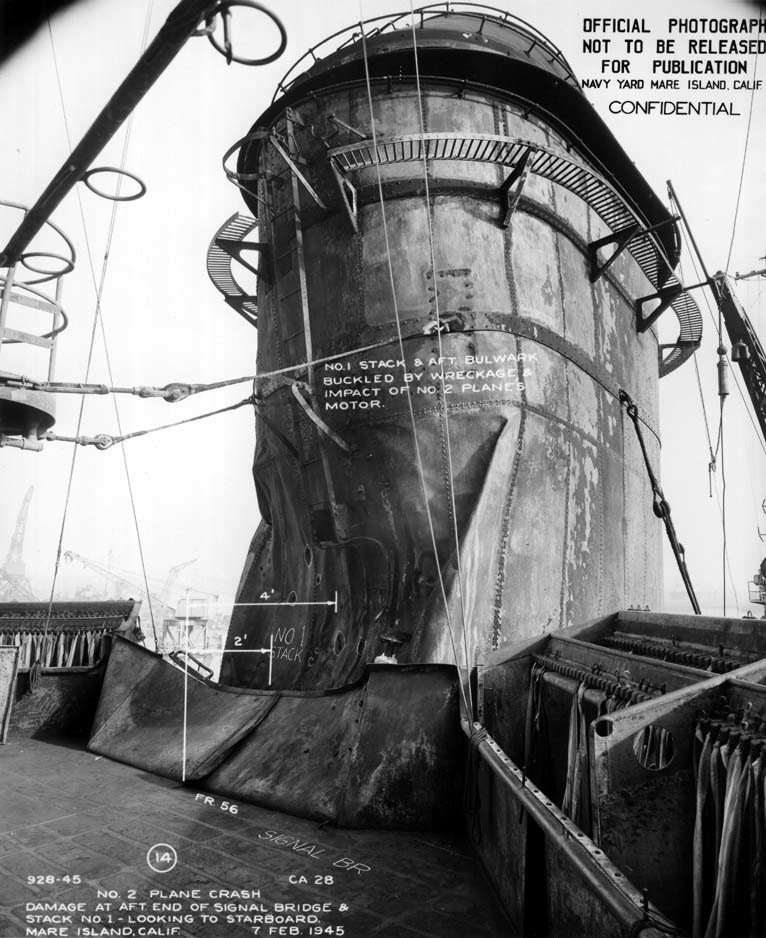 06 February 1945 photo of starboard side forward superstructure showing location and damage from 2 kamikaze hits taken on 6 January 1945. NARA San Francisco, Mare Island Ship Files #893-45. |