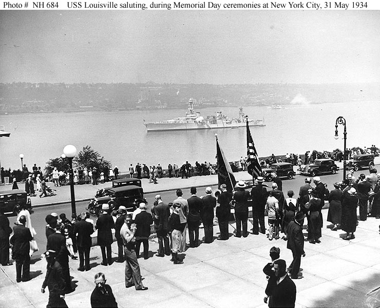 USS Louisville (CA 28) steams past Battery Park, at the southern tip of Manhattan Island, New York City, in 1934 . U.S. Naval Historical Center Photograph #NH 51905. |