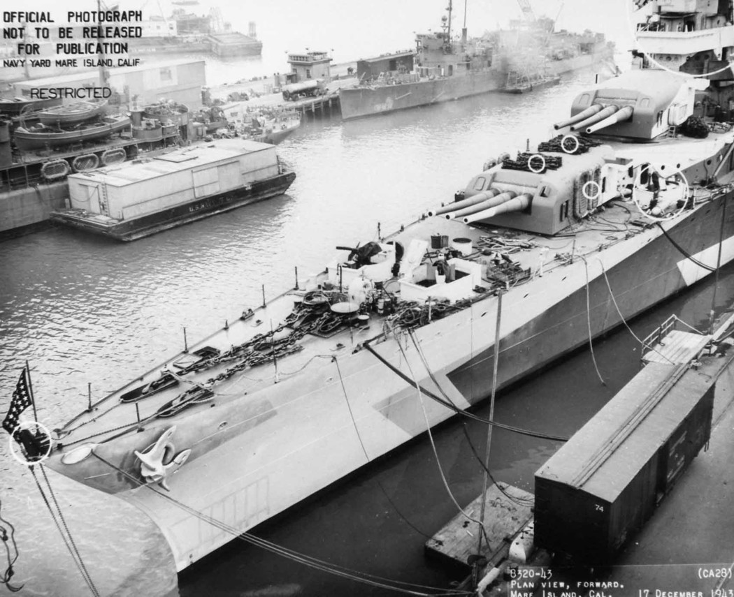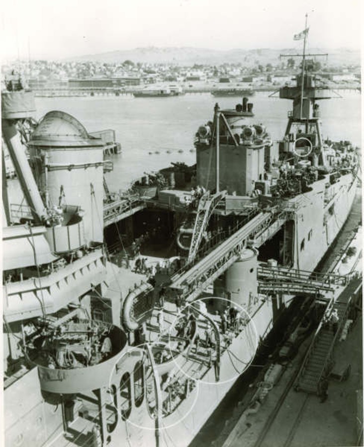 Forward plan view of USS Louisville (CA 28) at Mare Island on 17 Dec 1943. Louisville was in overhaul at Mare Island from 8 Oct until 24 Dec 1943. The stern of USS Chincoteague (AVP 24) and the bow of the USS Ballard (AVD 10) can be seen above Louisville. Mare Island Navy Yard Photo #8320-43. |