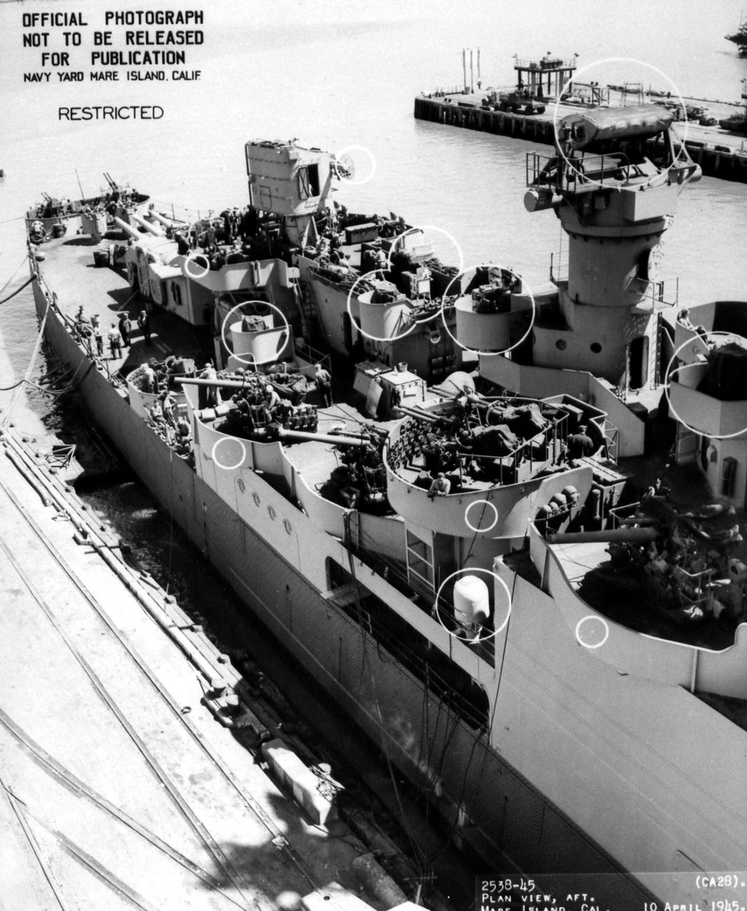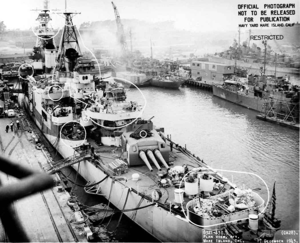 Aft plan view of USS Louisville (CA 28) at Mare Island on 10 April 1945. Mare Island Navy Yard Photo #2538-45. |
