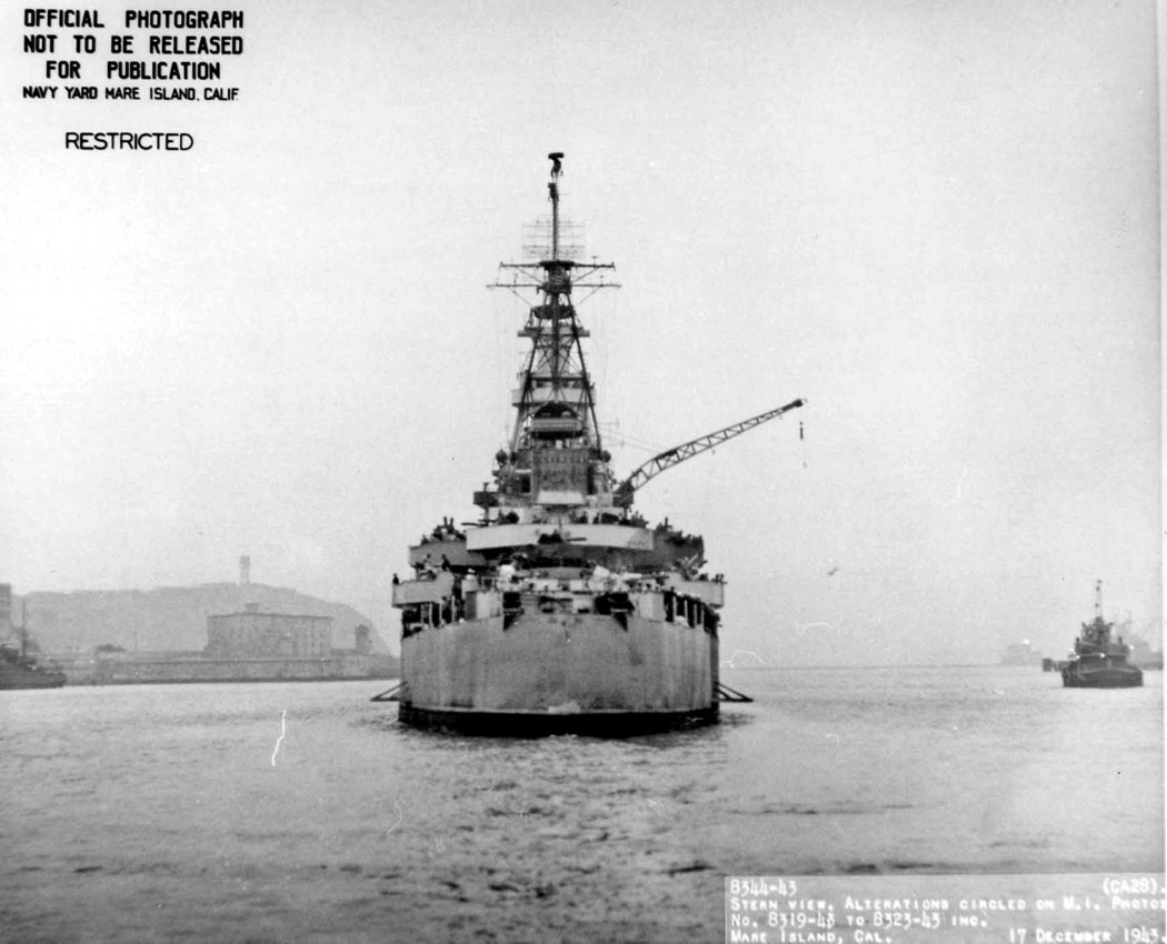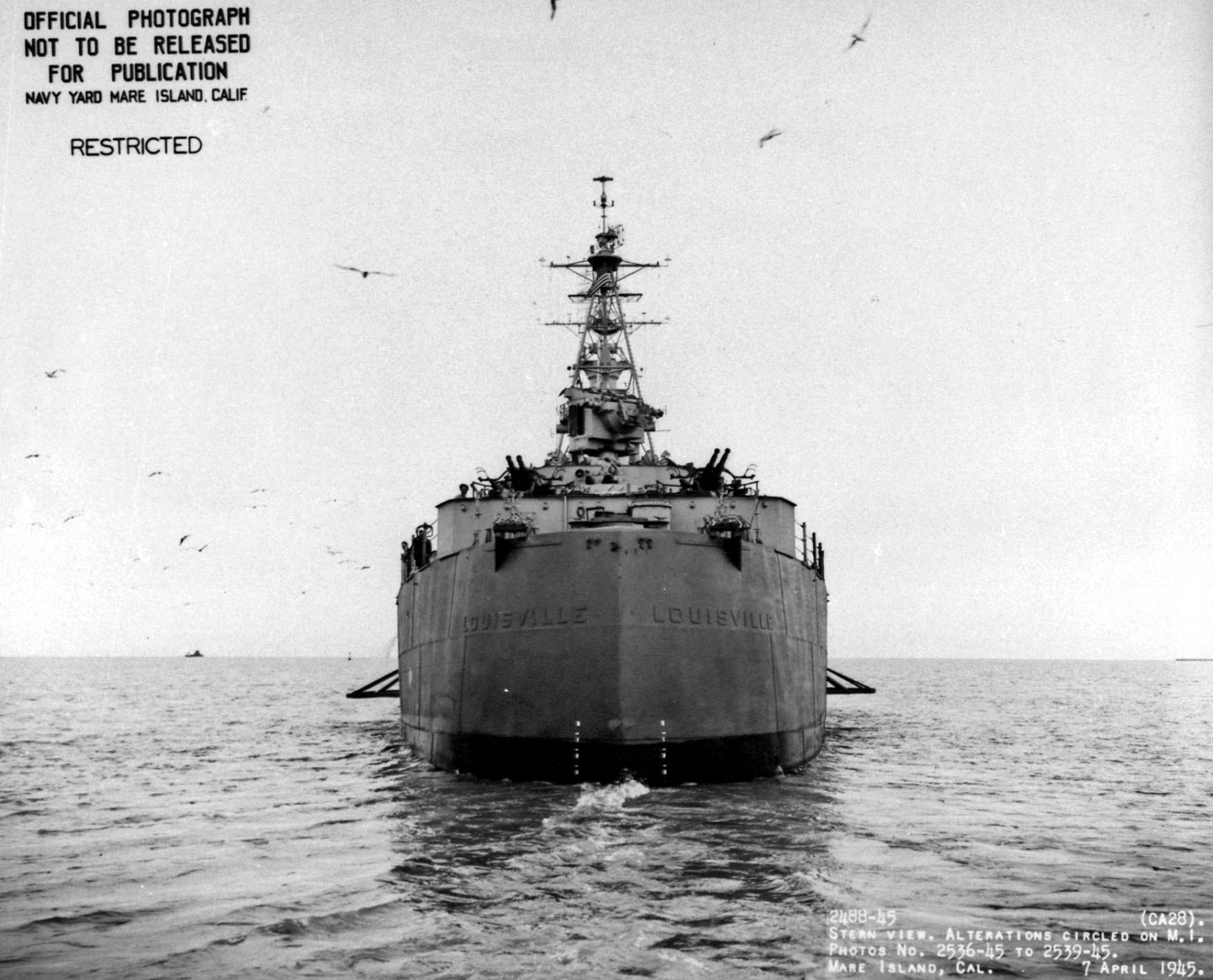 Stern view of USS Louisville (CA 28) off Mare Island on 7 April 1945. Mare Island Navy Yard Photo #2488-45. |