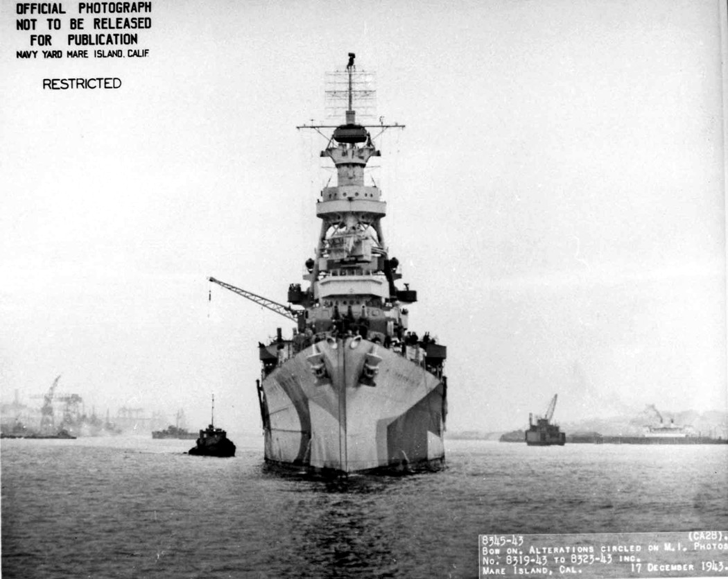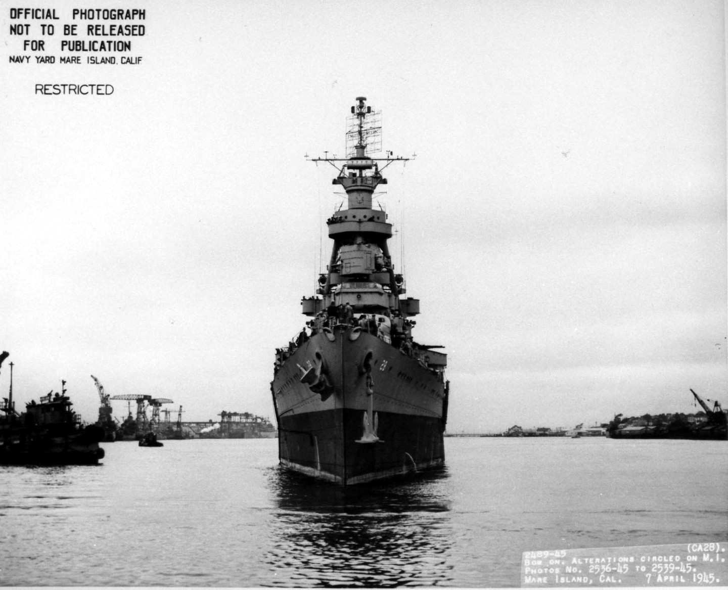 Bow on view of USS Louisville (CA 28) departing Mare Island on 7 April 1945. Mare Island Navy Yard Photo #2489-45. |