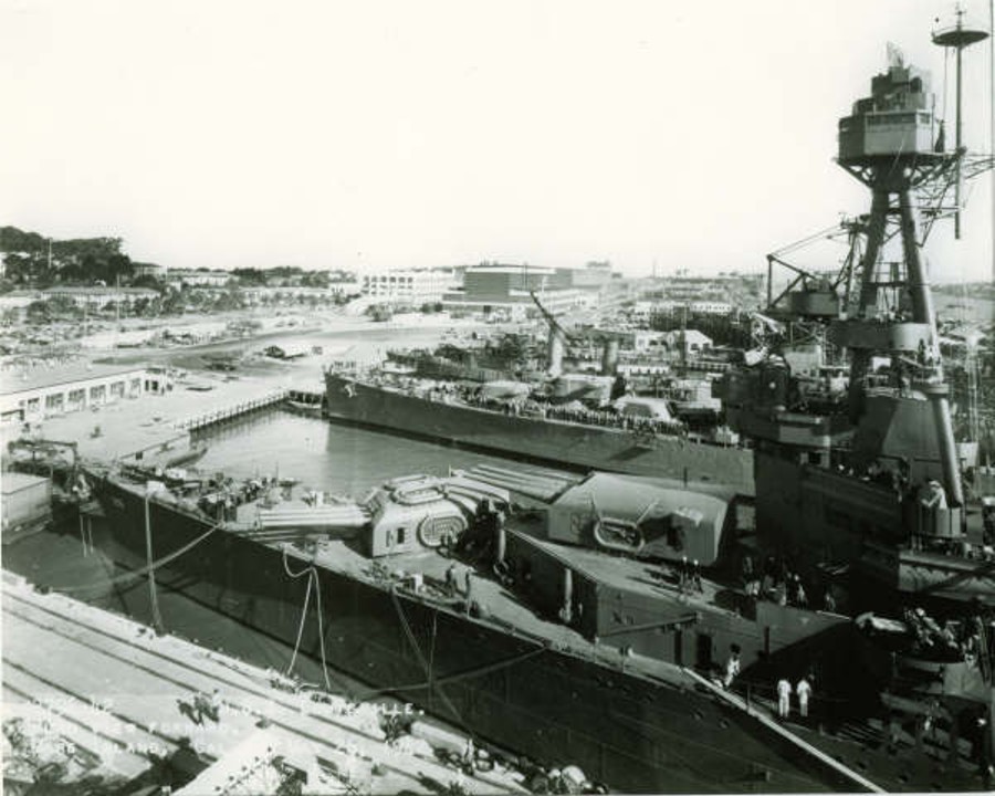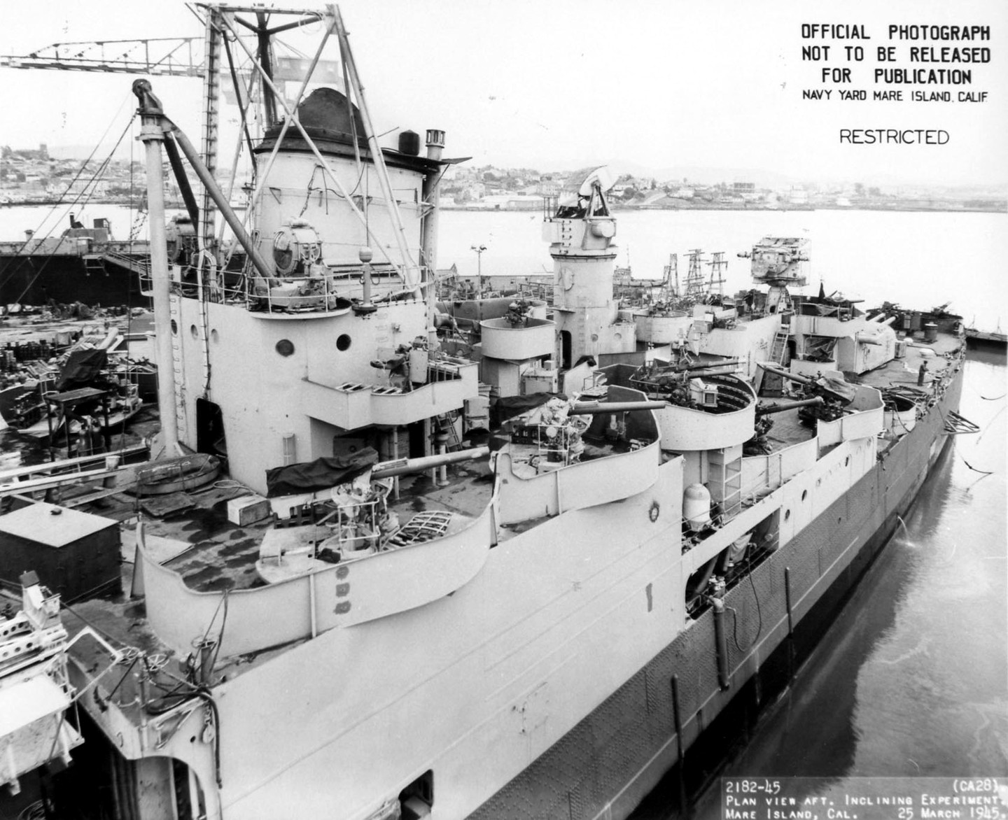 Aft plan view of USS Louisville (CA 28) at Mare Island in dry dock #2 for an inclining experiment on 25 March 1945. She was not landed on the dry dock blocks during this period. She was in overhaul at the yard from 6 Feb until 13 April 1945. Mare Island Navy Yard Photo #2182-45. |