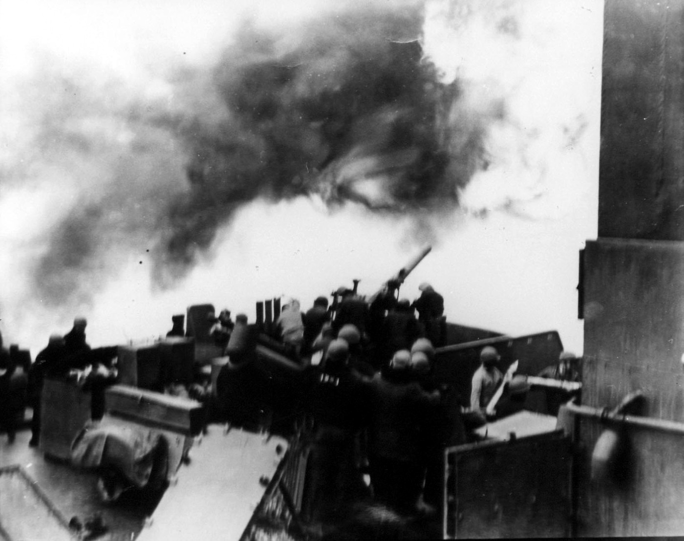 View of wrecked 40mm quad mount and other kamikaze damage by the bridge received January 1945 in Lingayen Gulf. Taken at Mare Island, 7 February 1945. Naval History and Heritage Command photo #NH 92367. |