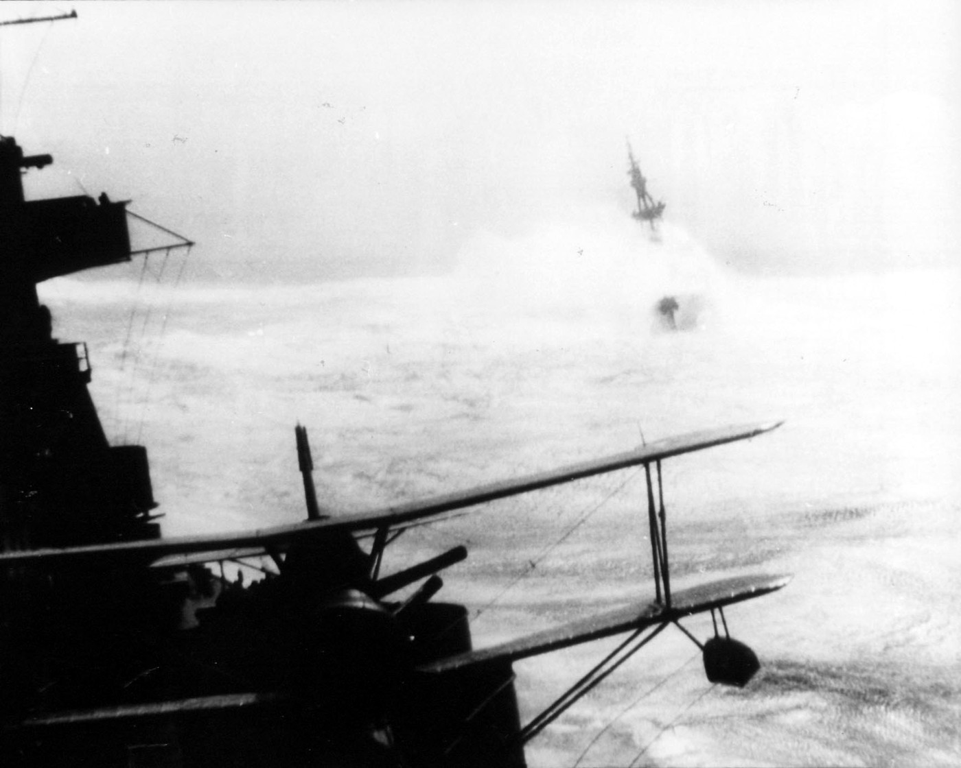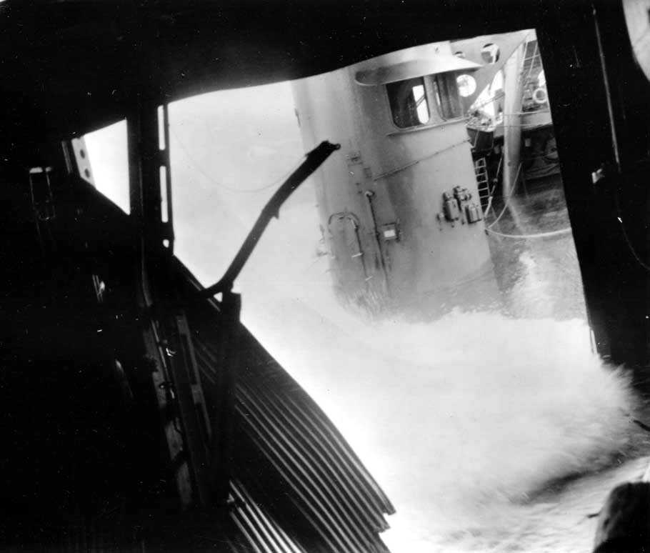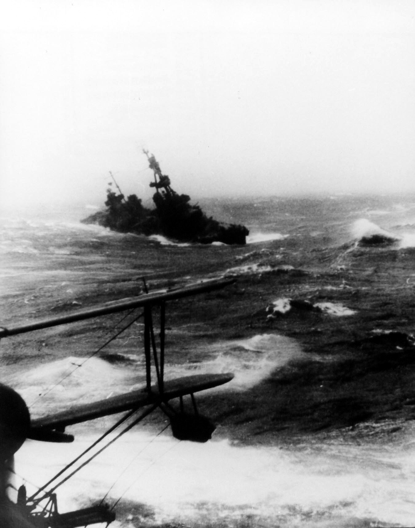USS Louisville (CA 28) in rough weather possibly in the Aleutian Islands in 1943. Mare Island Navy Yard Photo #3180-44. |