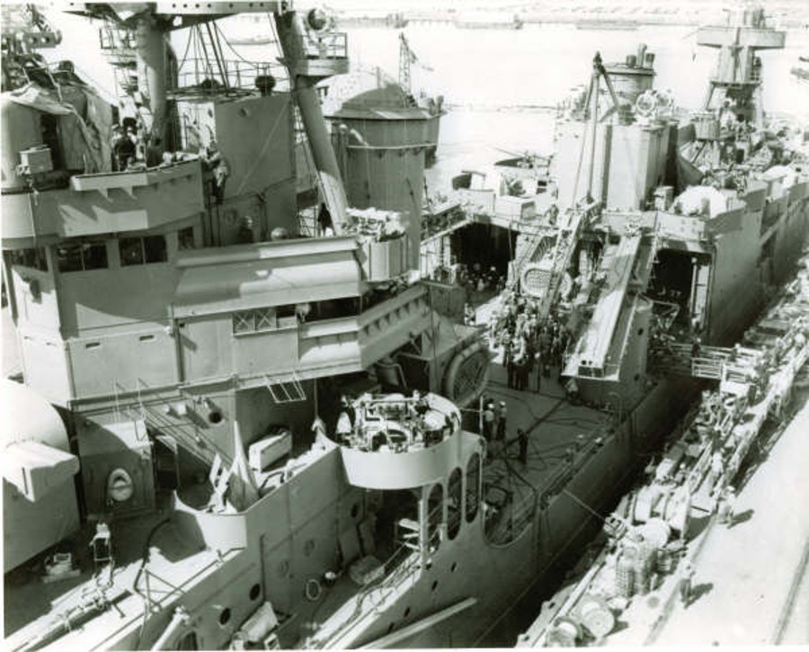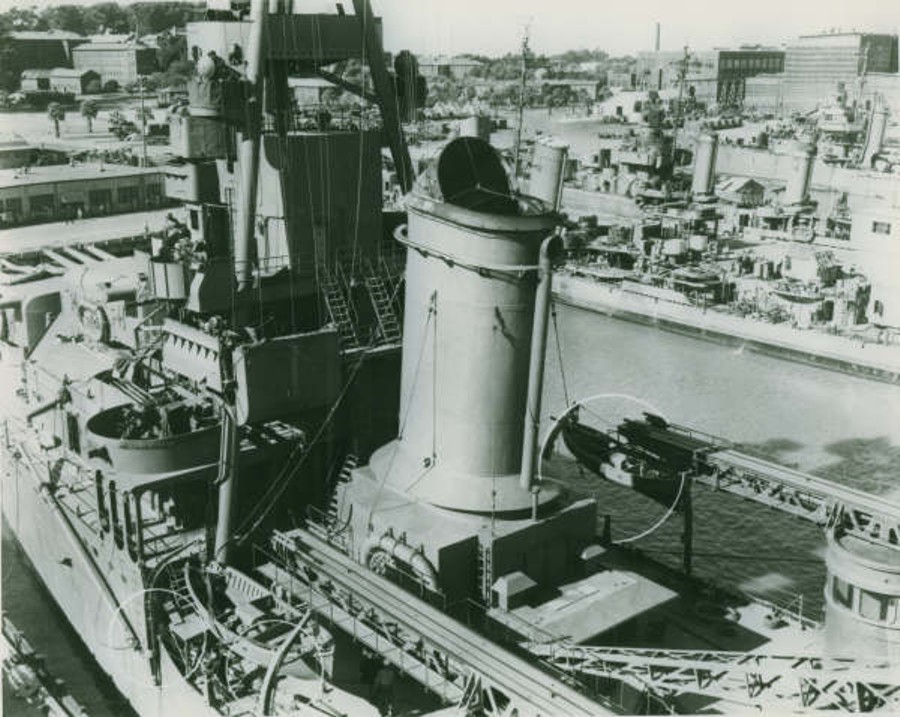 118k | View aft. Mare Island,CA 26 May 1942. Note the light cruiser USS Helena (CL 50) fitting out at the next pier. | Pieter Bakels |