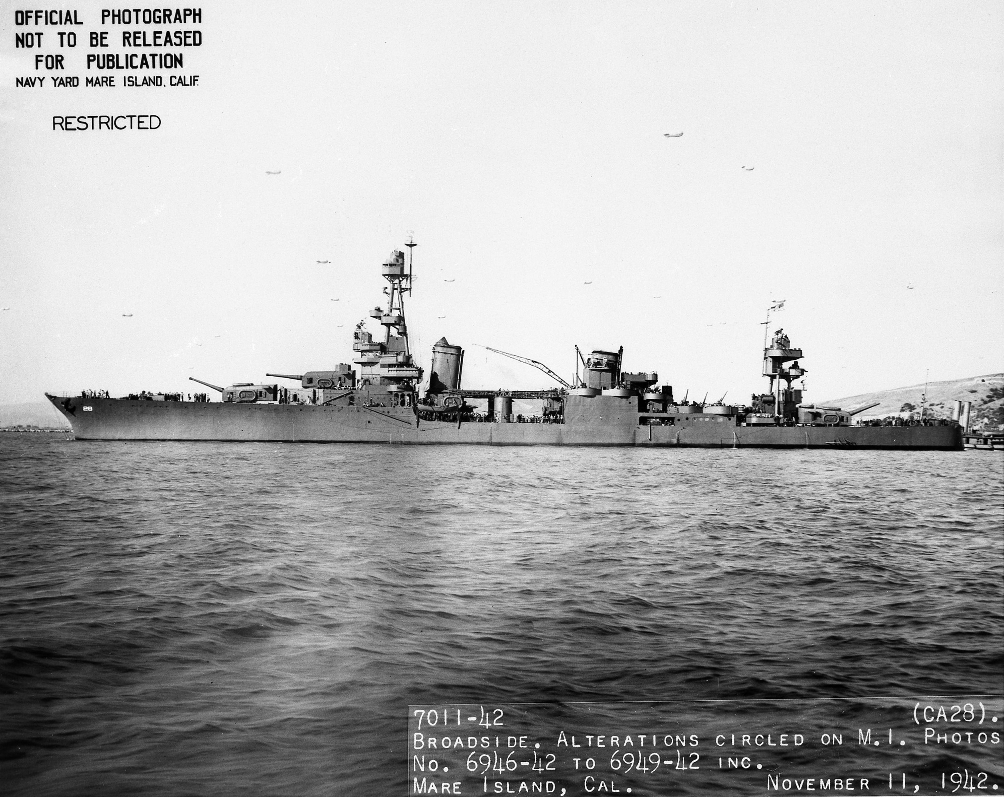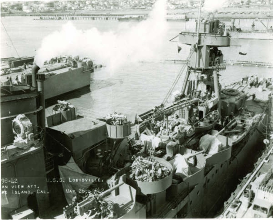 28k | USS Louisville (CA 28) off the Mare Island Navy Yard, California, 26 May 1942. Photograph from the Bureau of Ships Collection in the U.S. National Archives. |