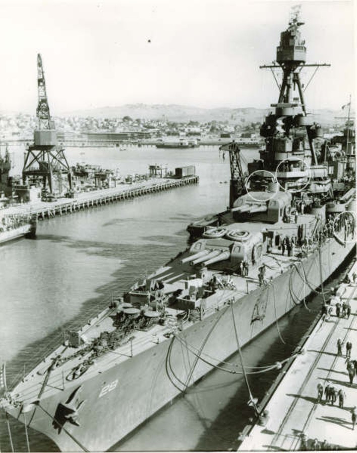 1.5m | USS Louisville (CA 28) off the south end of Mare Island Navy Yard. She was at the yard from 23 October - 11 November 1942 for repairs. Note the large number of barrage balloons above the yard in the background. Photo from the Vallejo Naval & Historical Museum. |