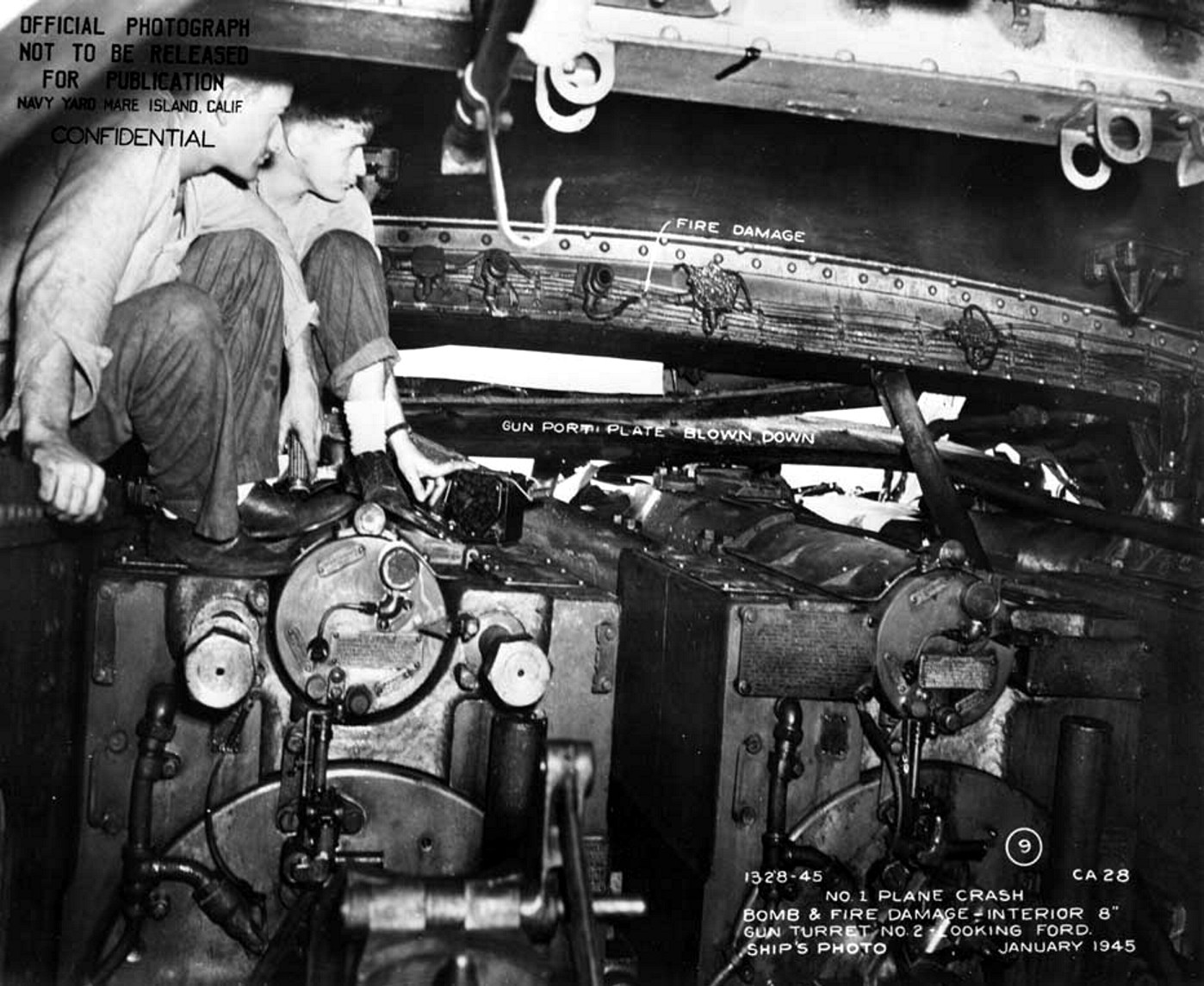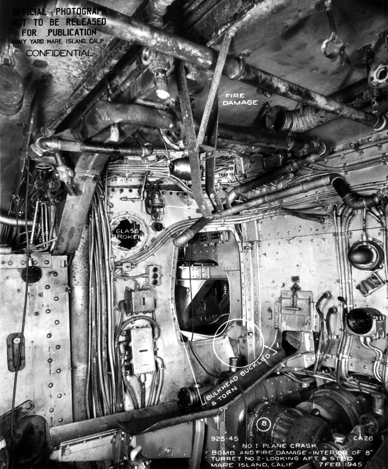 View of Turret 2 interior showing damage sustained by impact of Kamikaze #1 and detonation of bomb it was carrying Photo taken on 07 February 1945 while at Mare Island for repairs. National Archives, San Francisco Branch, Mare Island Naval Shipyard General Correspondence files, 1941-47. |