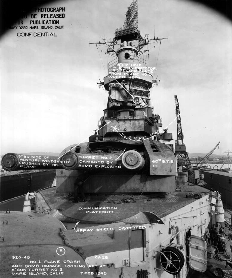 View looking aft at Turret #2 and superstructure showing path of Kamikaze #1 along with the damage caused by bomb detonation and impact from plane. Note the propeller embedded in 5" Gun Director. Photo taken on 07 February 1945 at Mare Island. National Archives, San Francisco Branch, Mare Island Naval Shipyard General Correspondence files, 1941-47. |