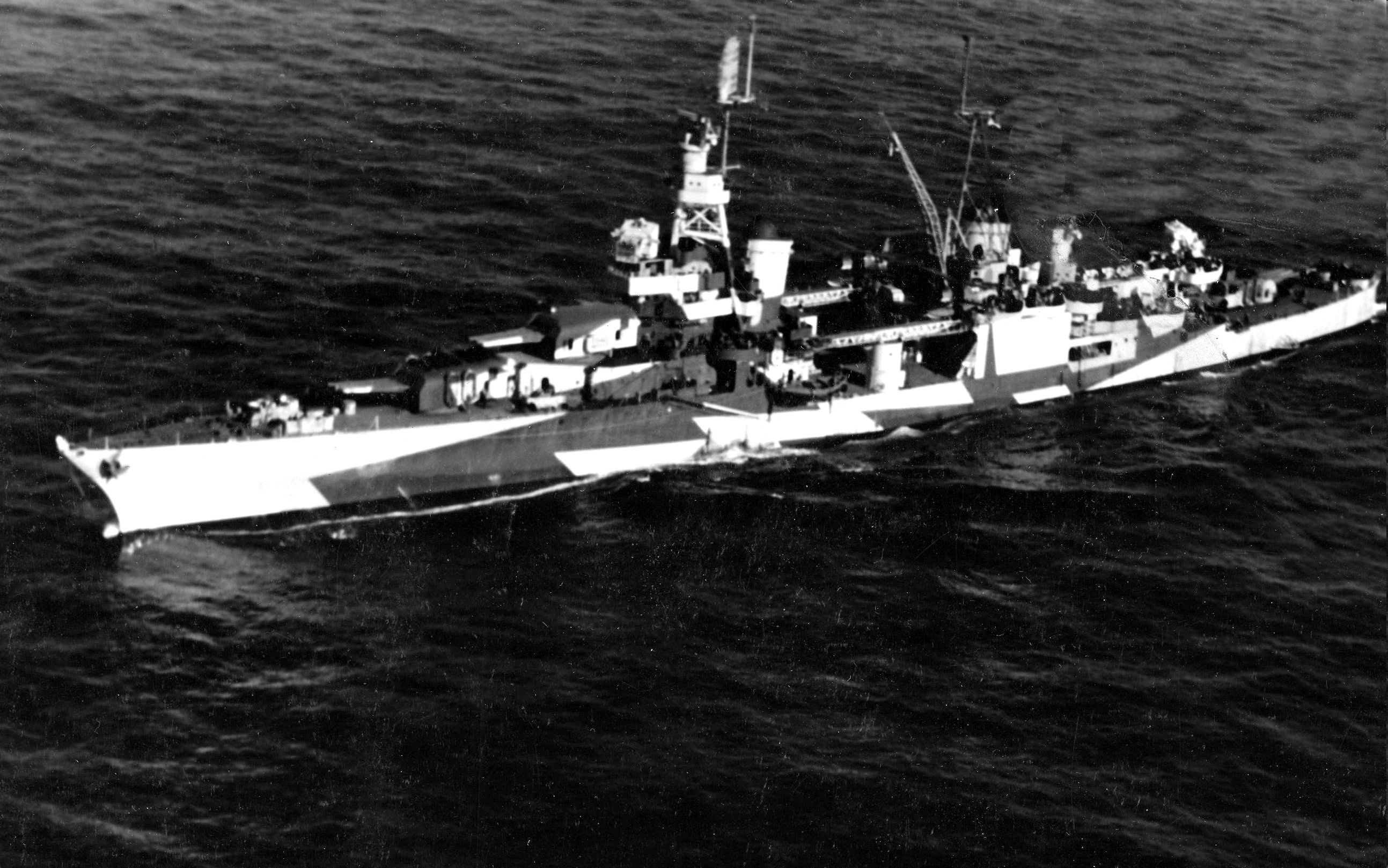 USS Louisville (CA 28) operating in the Bering Sea during May 1943. She is followed by USS San Francisco (CA 38) . Collection of Vice Admiral Robert C. Giffen. U.S. Naval Historical Center Photograph #NH 94642. |