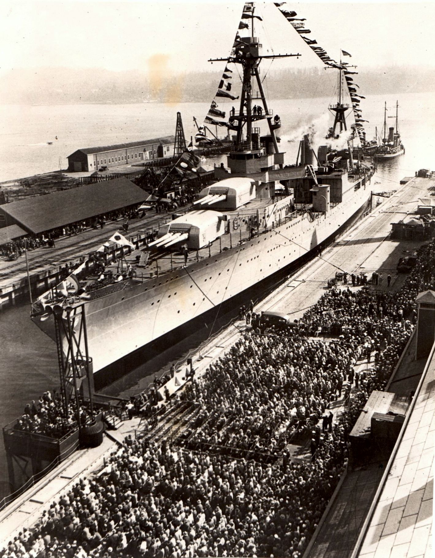 The Christening and "Launching" of Louisville on 01 September 1930. All ships built at Puget Sound Naval Shipyard were constructed in drydock, not on a shipway as in other shipyards. The "Launching" of a ship was just the flooding of the drydock. |