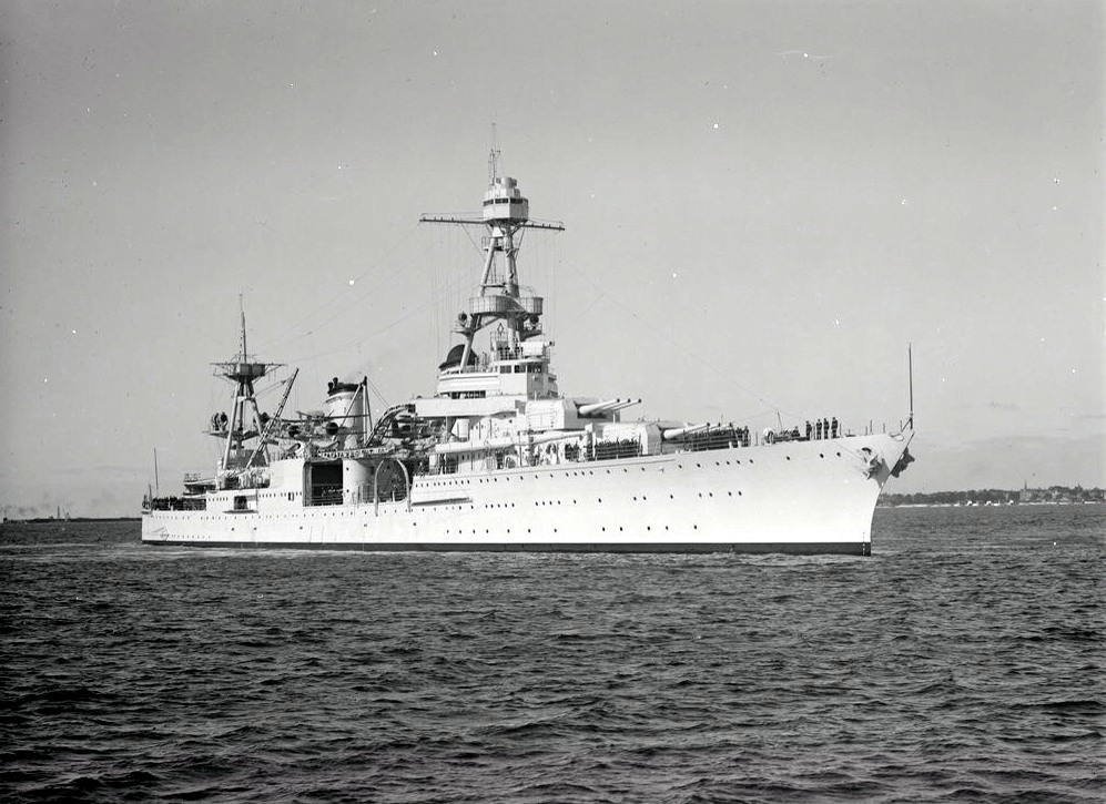 Starboard bow photo of the USS Louisville (CA 28) approaching Melbourne, Australia on 15 February 1938. State Library Victoria, Photo #H91.325/416 |