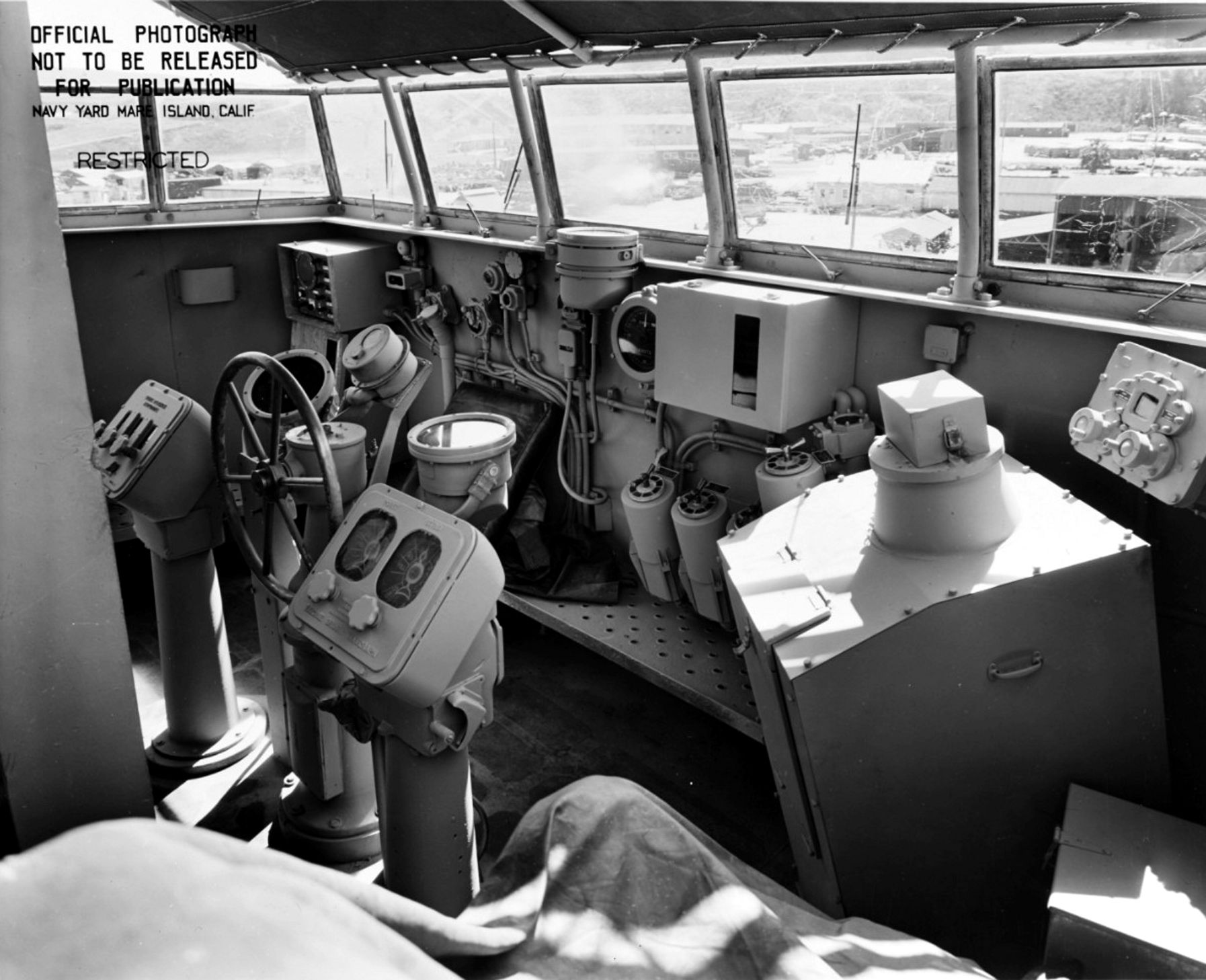 View on open bridge, at Mare Island Navy Yard, Mare Island, California, April 1945. Naval History and Heritage Command photo #NH 92375. |