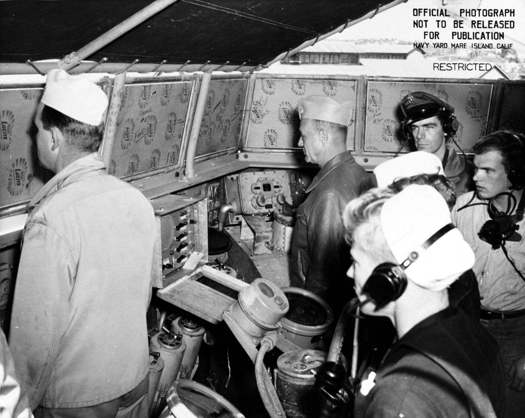 General quarters drill showing personnel at their stations on the open bridge, circa early April 1945. Taken at Mare Island Navy Yard. Note that protective paper has not yet been removed from new Lucite windscreens. Naval History and Heritage Command photo #NH 92378. |
