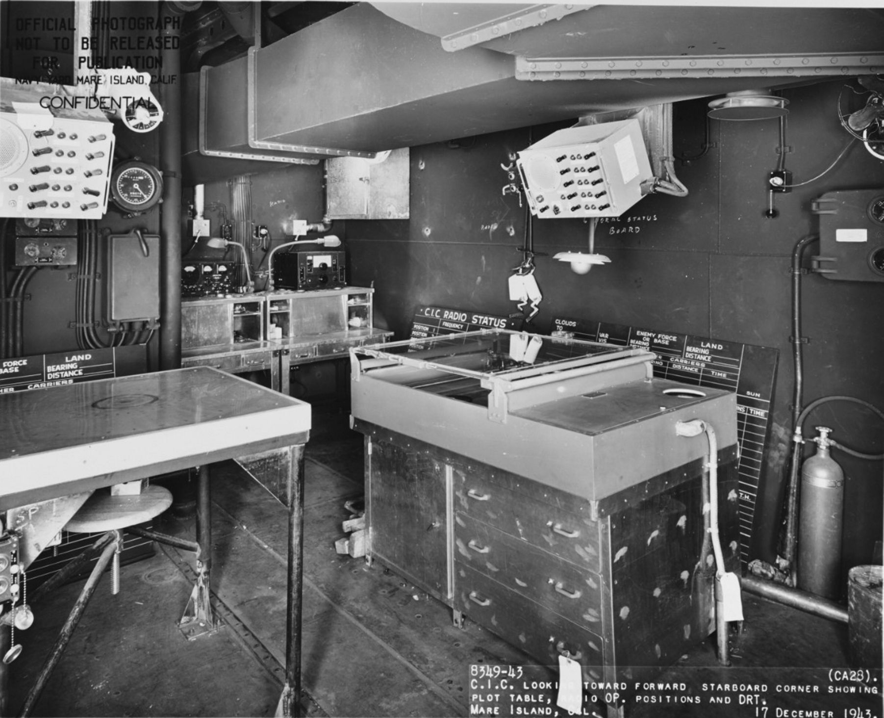 View in the Combat Information Center (CIC), taken at Mare Island Navy Yard, Mare Island, California, 17 December 1943. Naval History and Heritage Command photo #NH 92376. |
